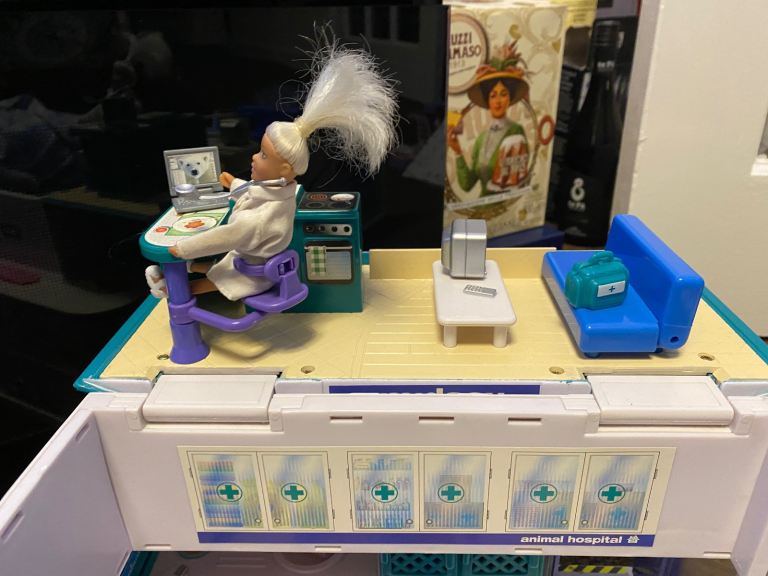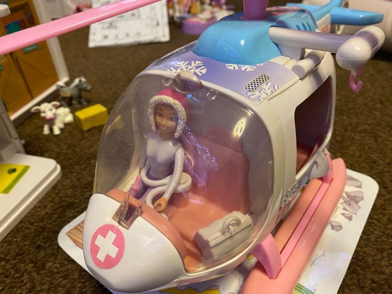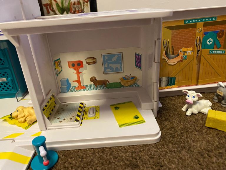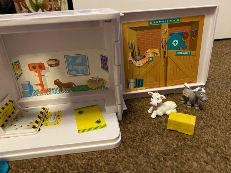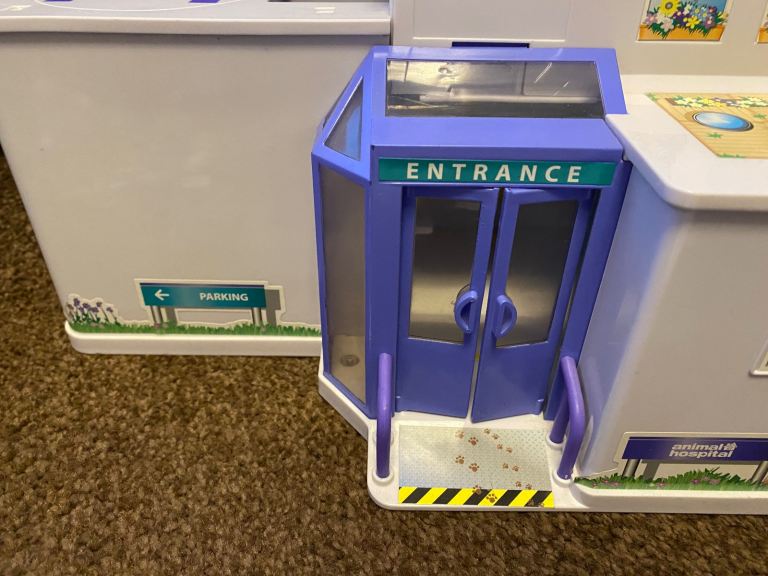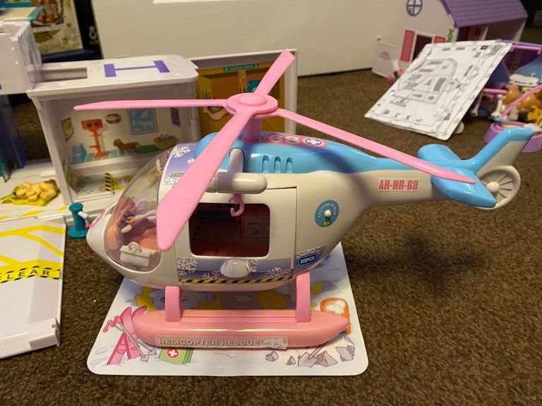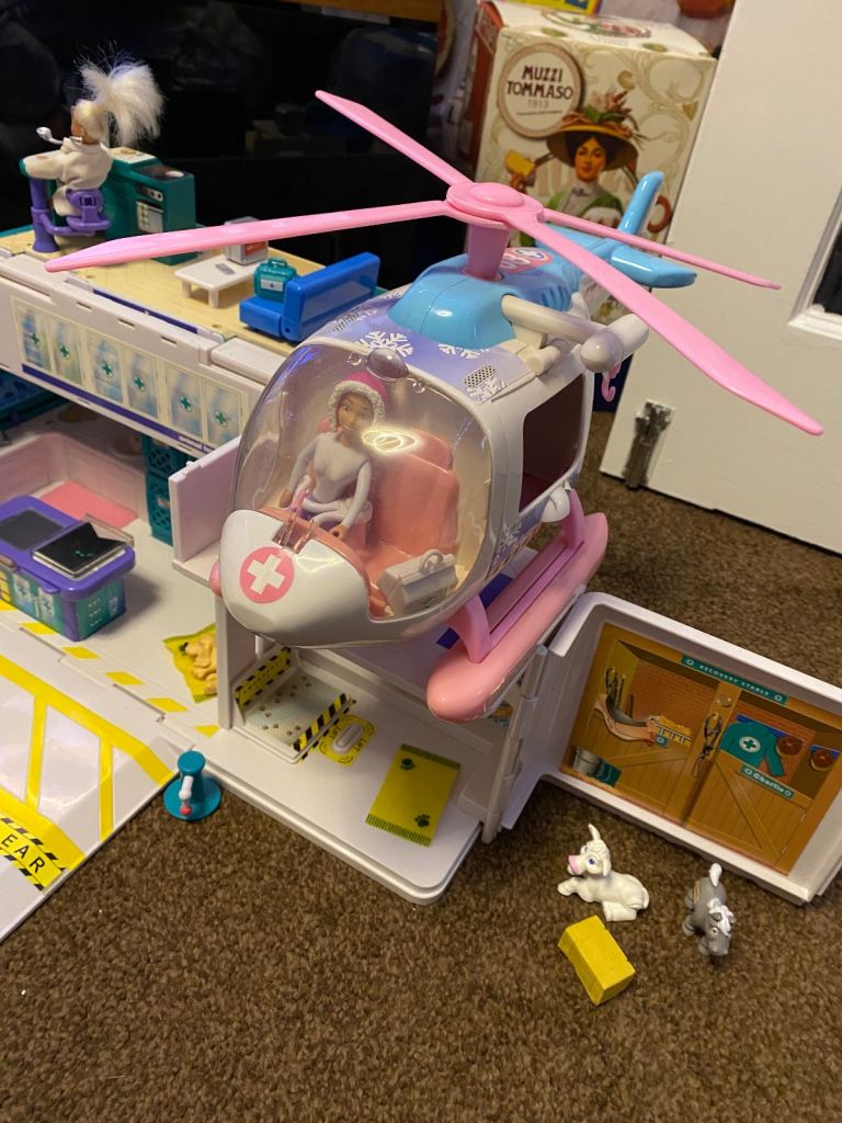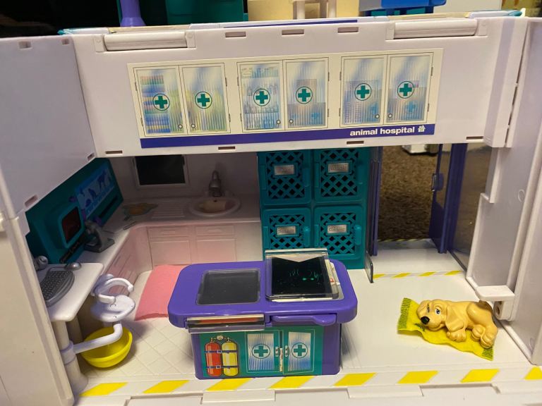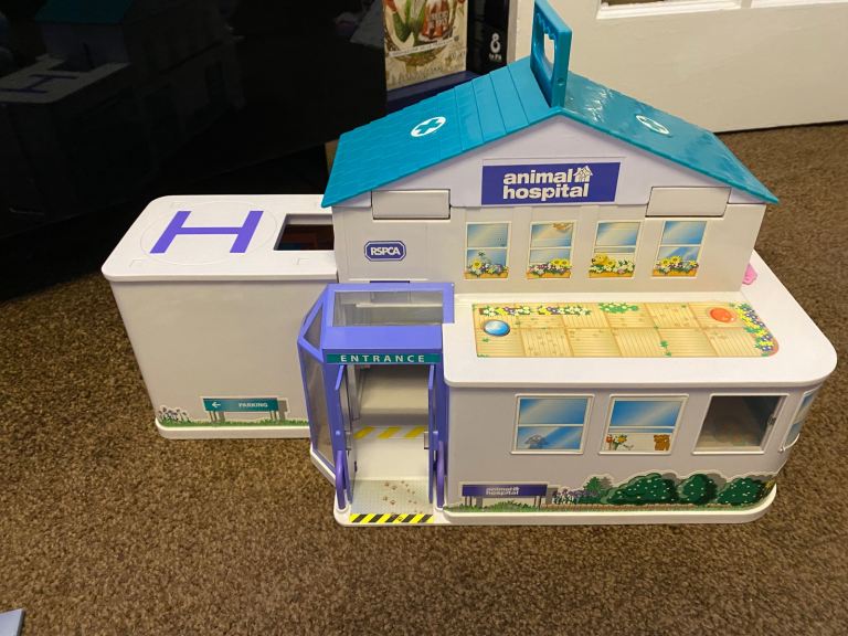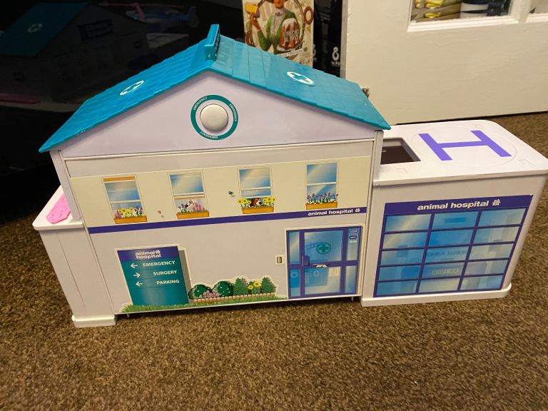 Animal hospital comes with helicopter and pad as well as lots of accessories and working parts. Used and in very good condition, many hours of fun in this set as you can see from pictures. This play set is from the early 00s. I have boxed this just not original box.
