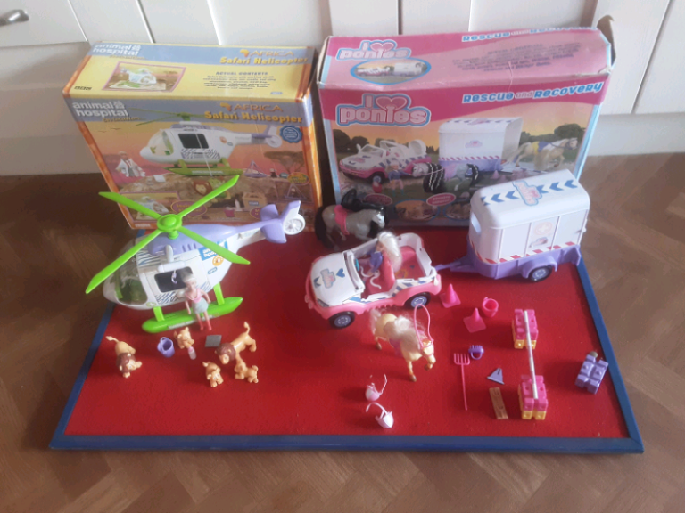 Two boxed sets .Animal hospital on location set boxed .with African safari helicopter. Tow opening doors. Winch, Lions and vet .Also a pony rescue and recovery set .With Jeep, horse box , two horses, accessories and trainer boxed .suitable from three years and up .£8 each or both for £14 .