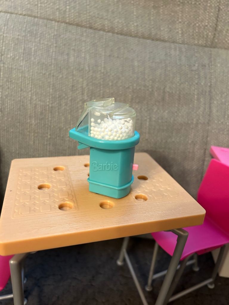 I am selling this Barbie cafe, table and chairs, little green table and little fireplace. Also this awesome Barbie popcorn toy. All in good condition, sold as seen. If your interested please contact me 😀