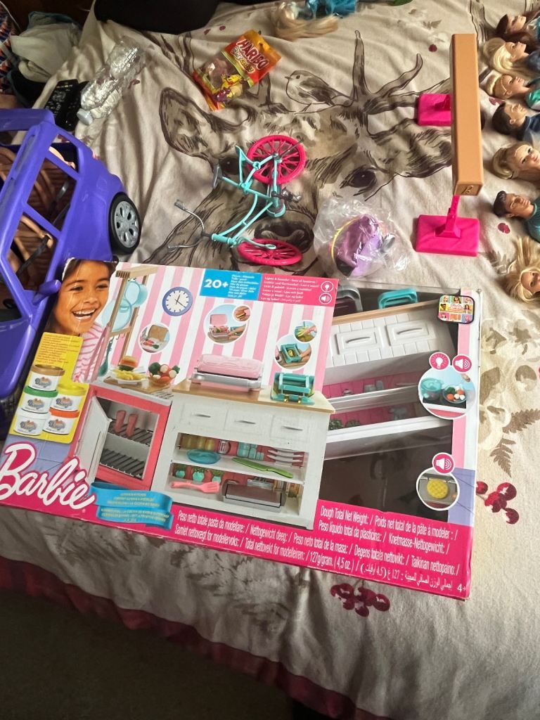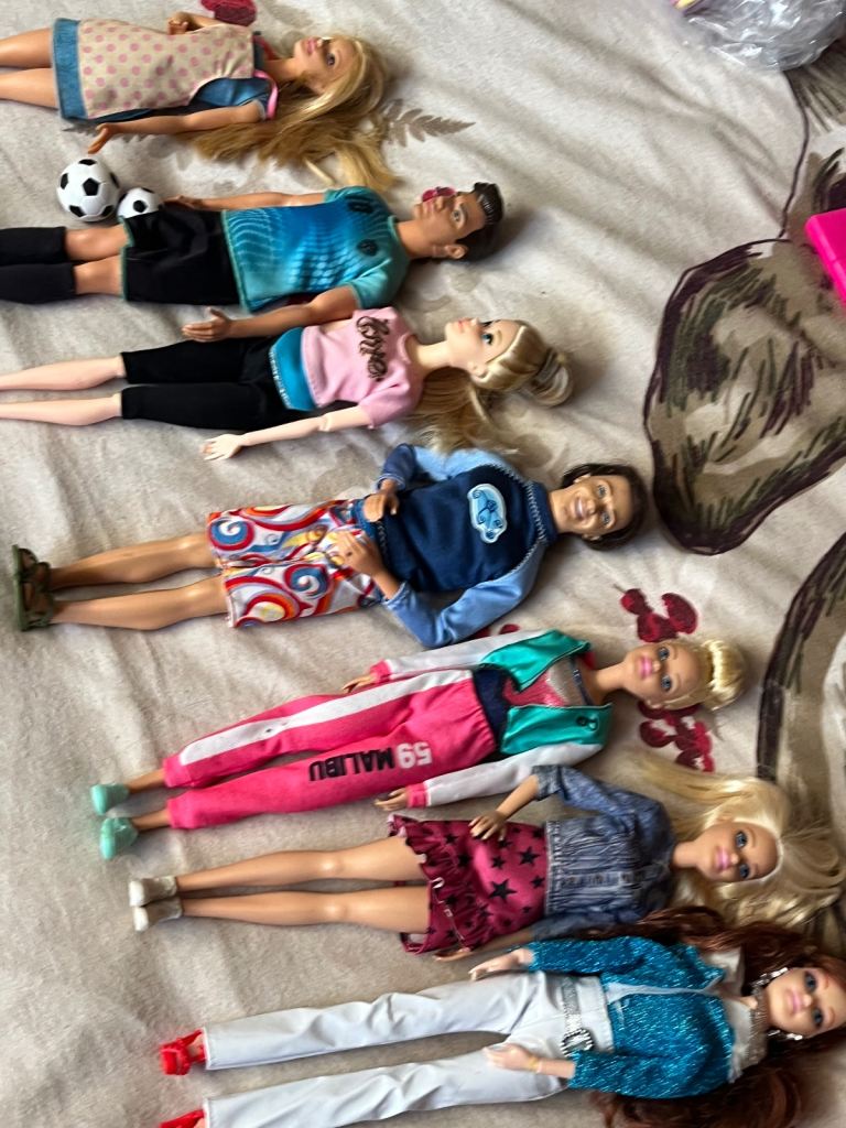 2 kens and 4 Barbie’s with car kitchen and bike and gymnastics bar good condition with all accessories