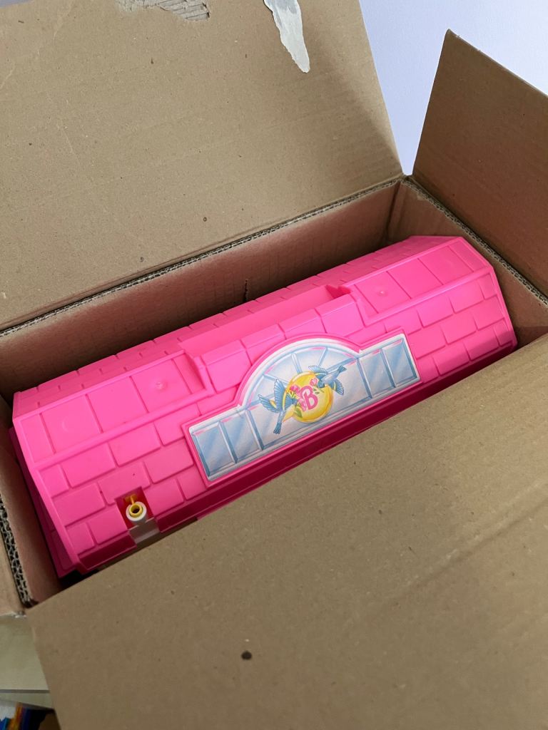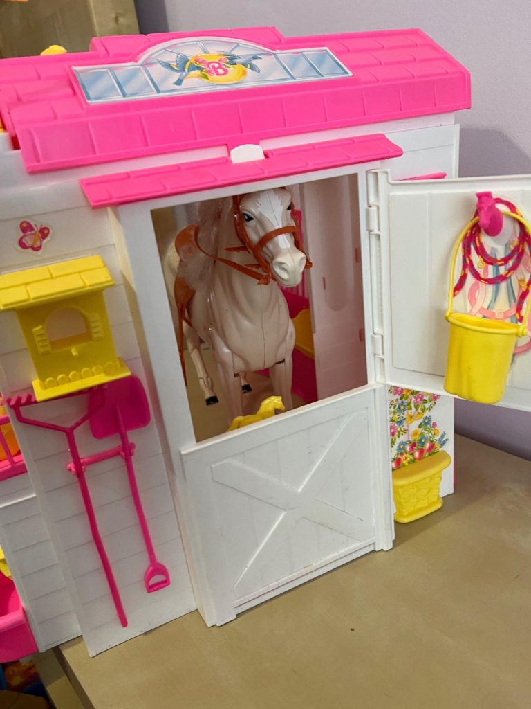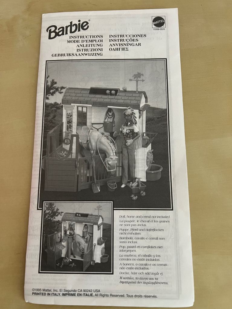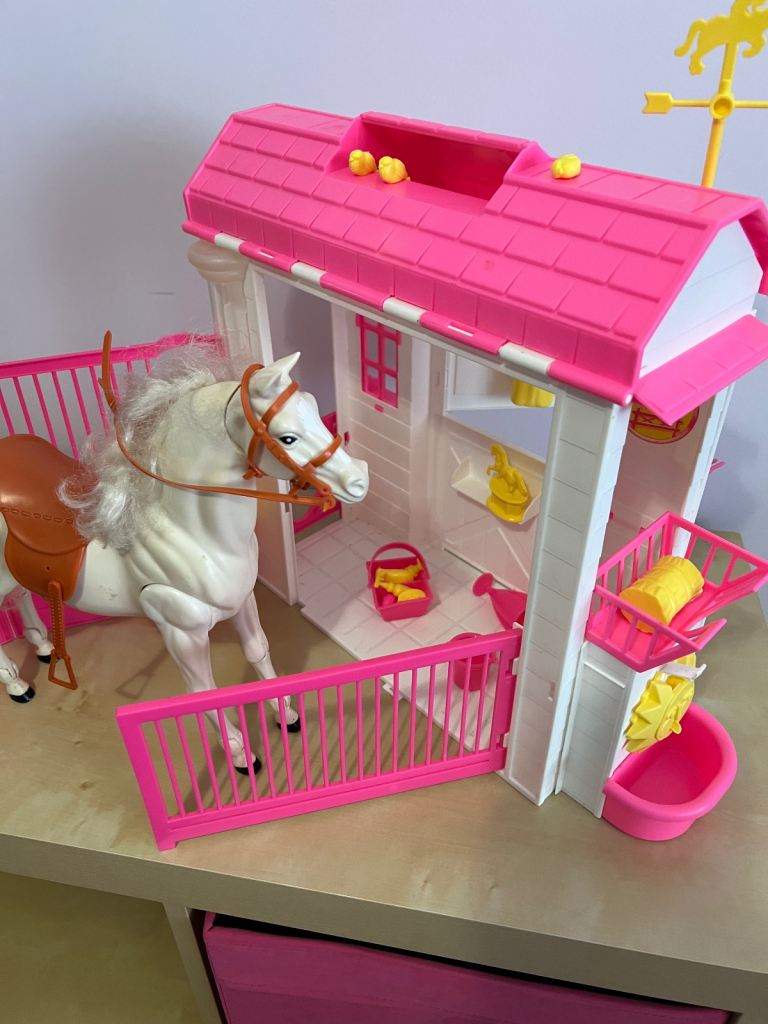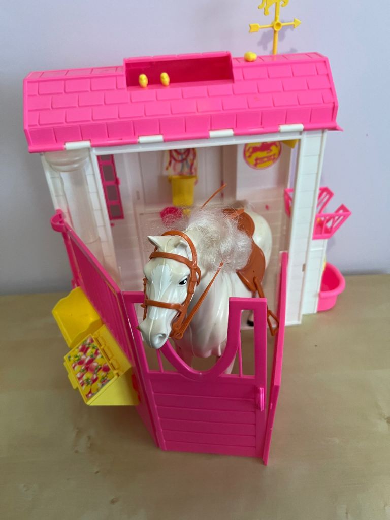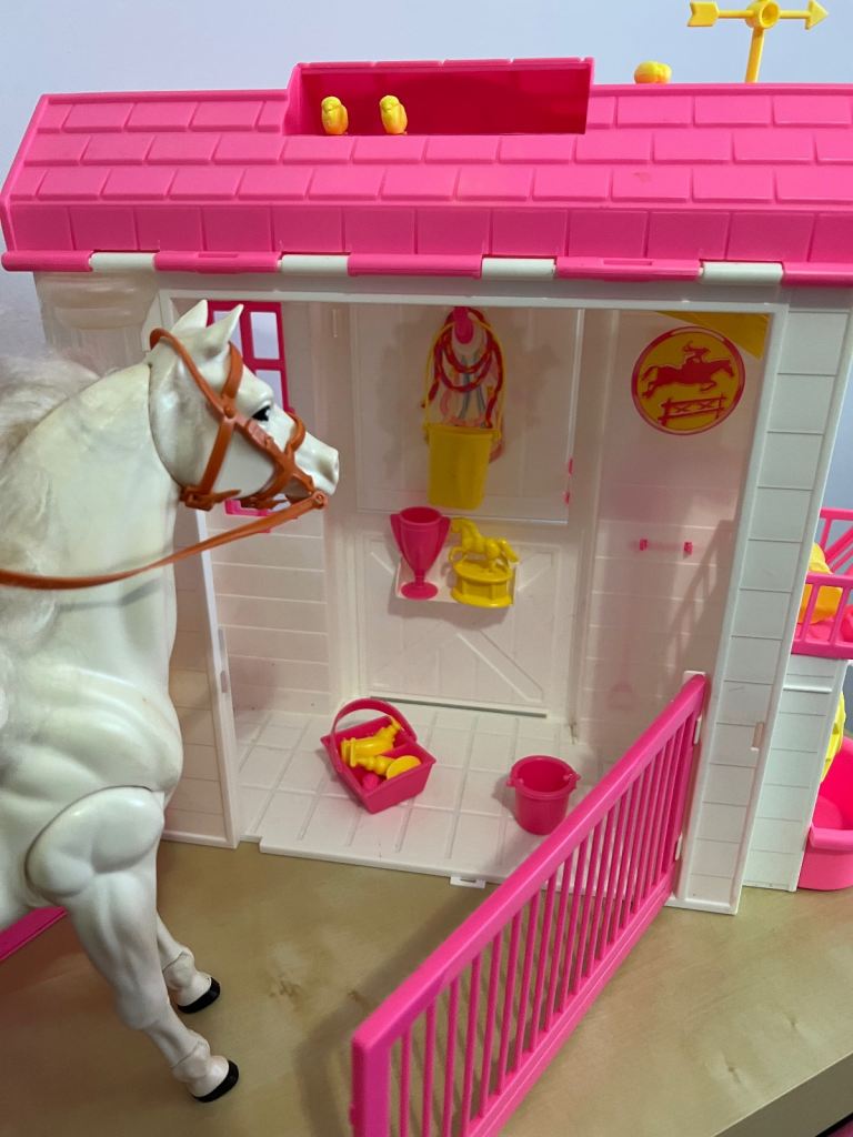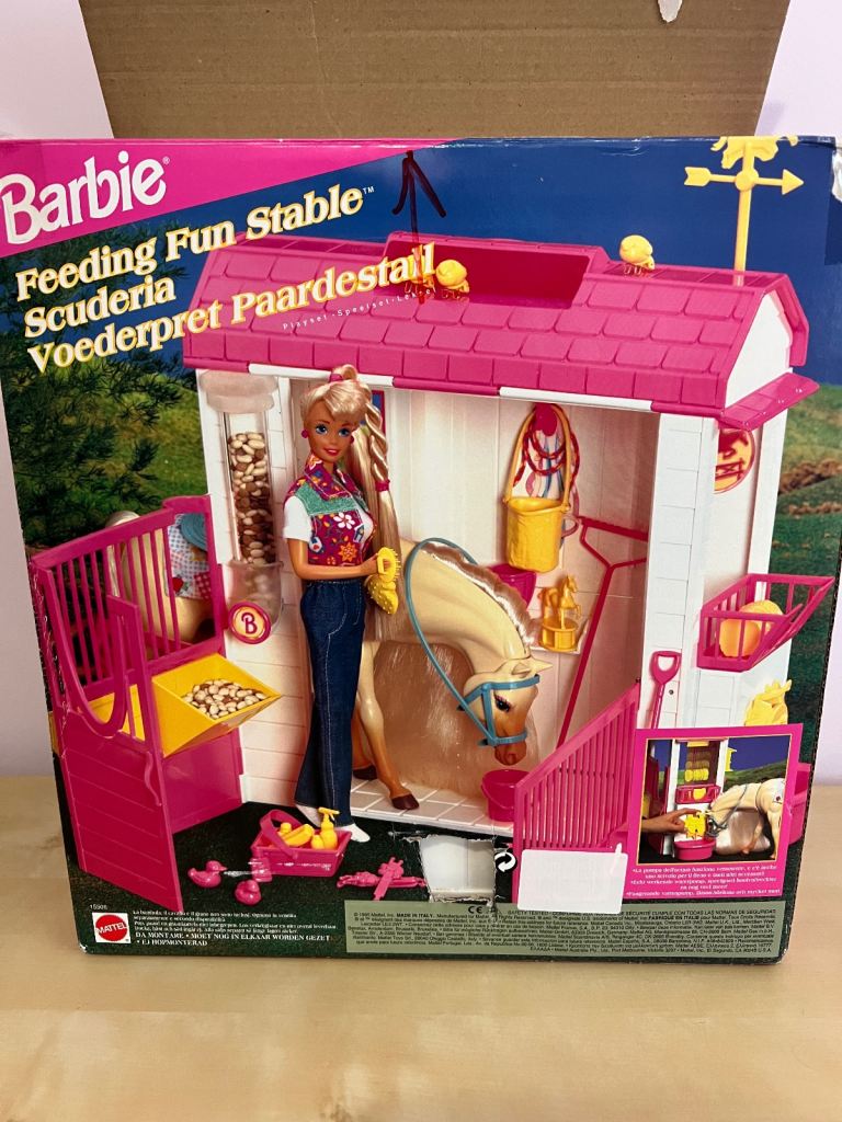 Barbie feeding fun stable, complete with horse and accessories. Including box and instructions for assembly.