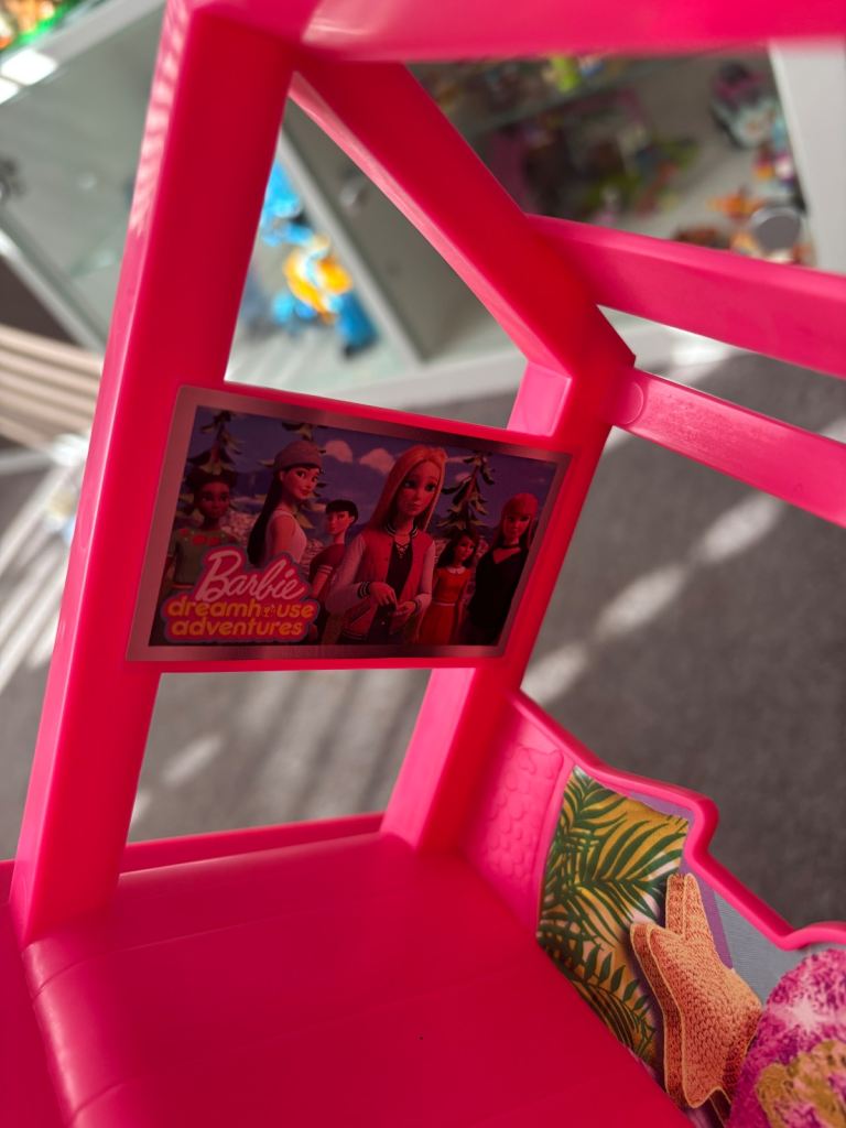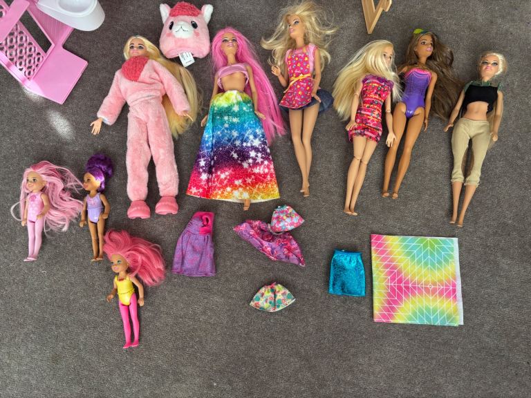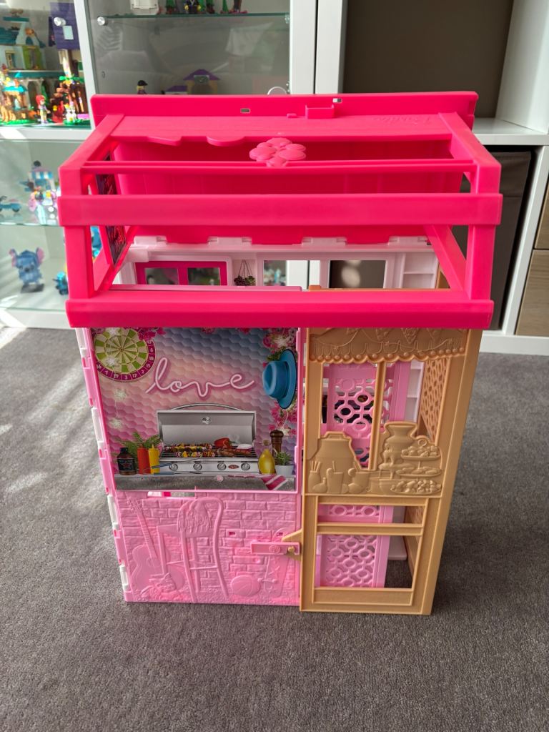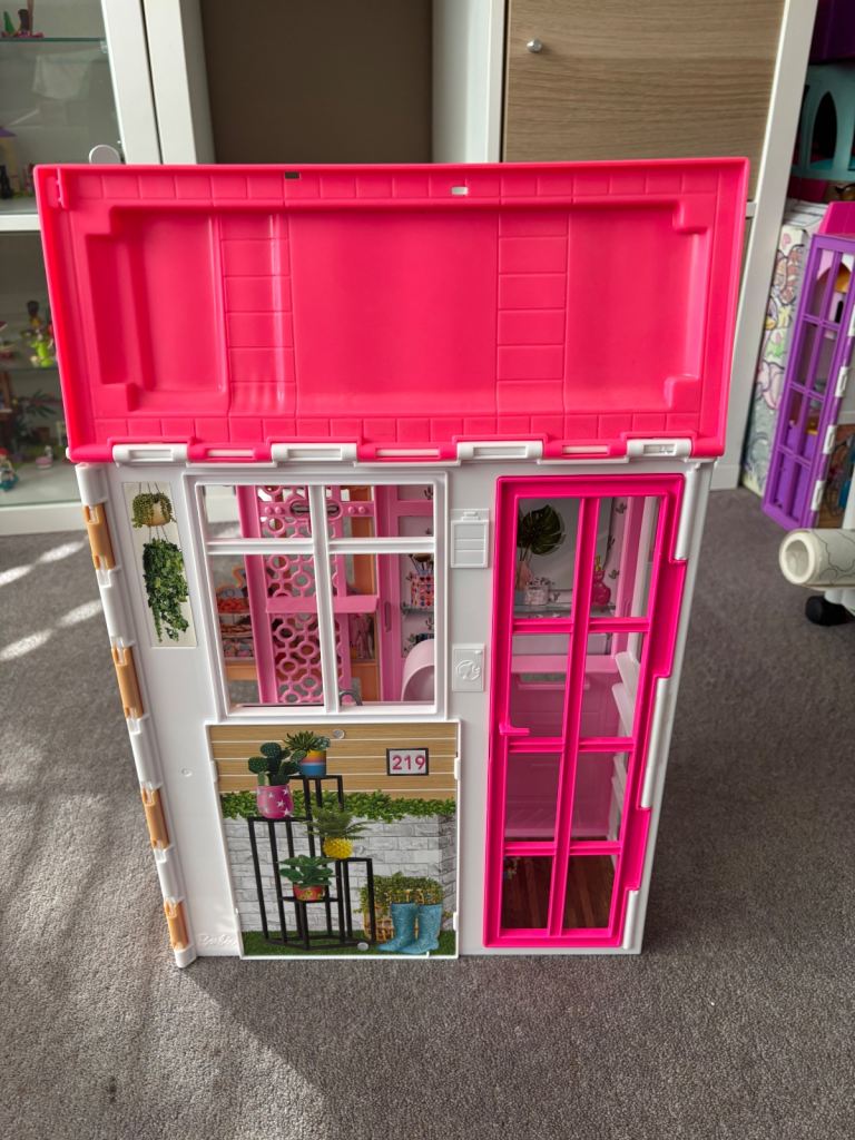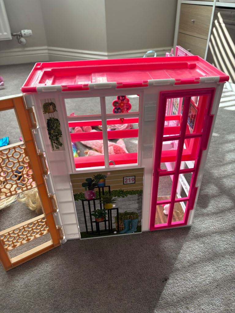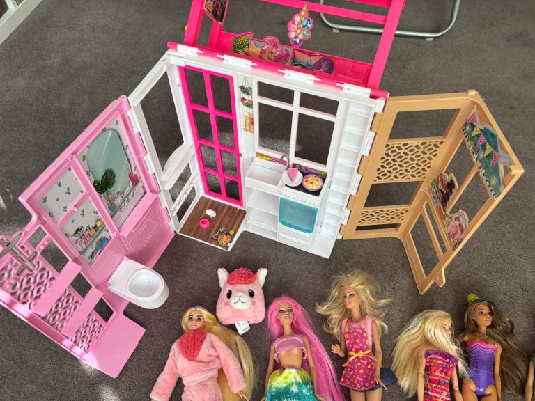 Barbie house playset that opens out with 6 Barbie dolls and 3 small dolls.