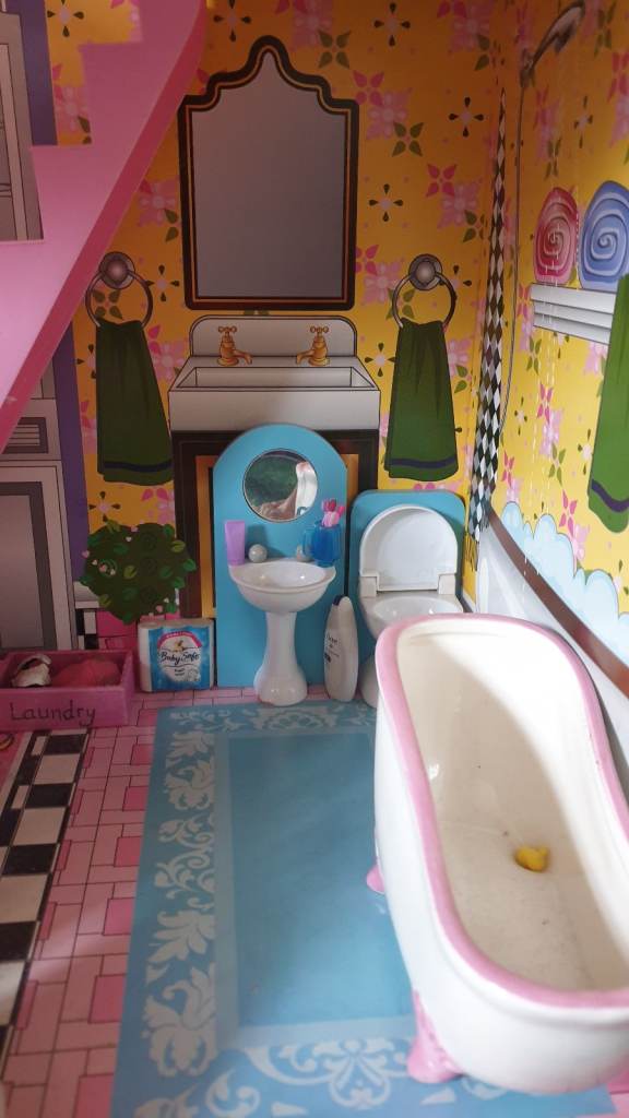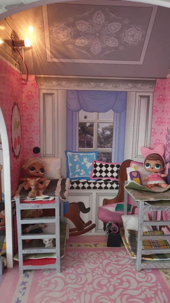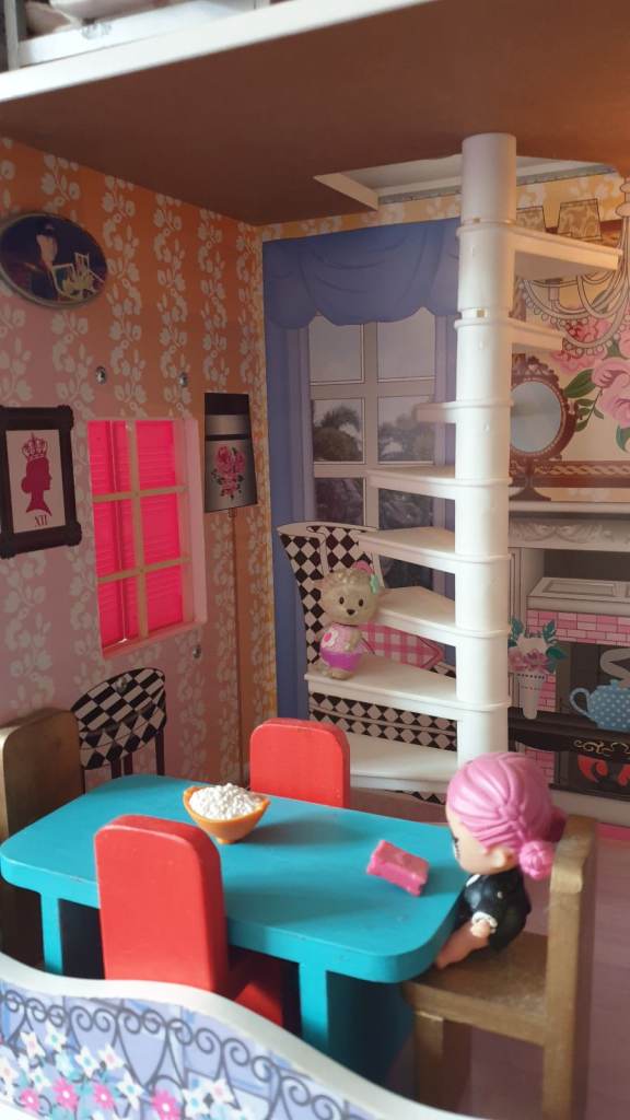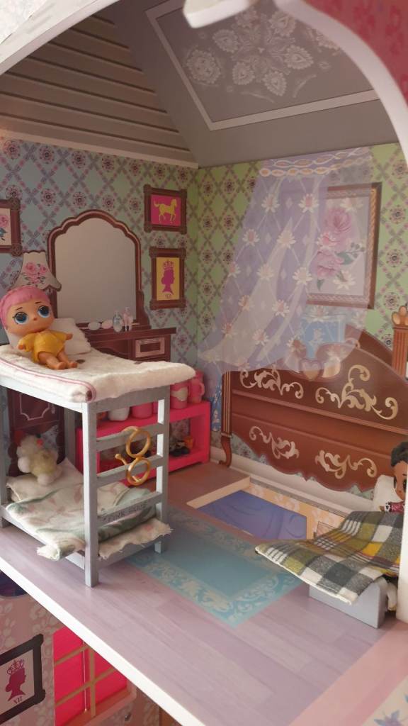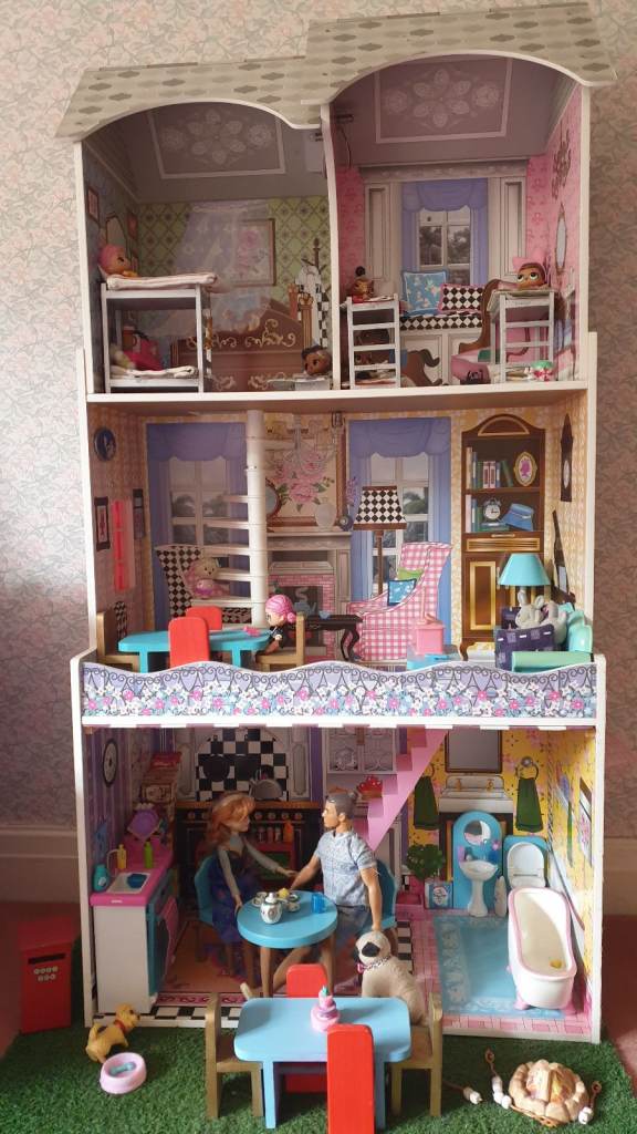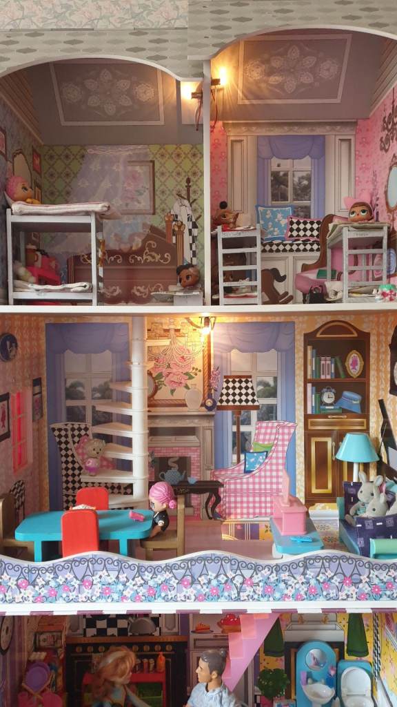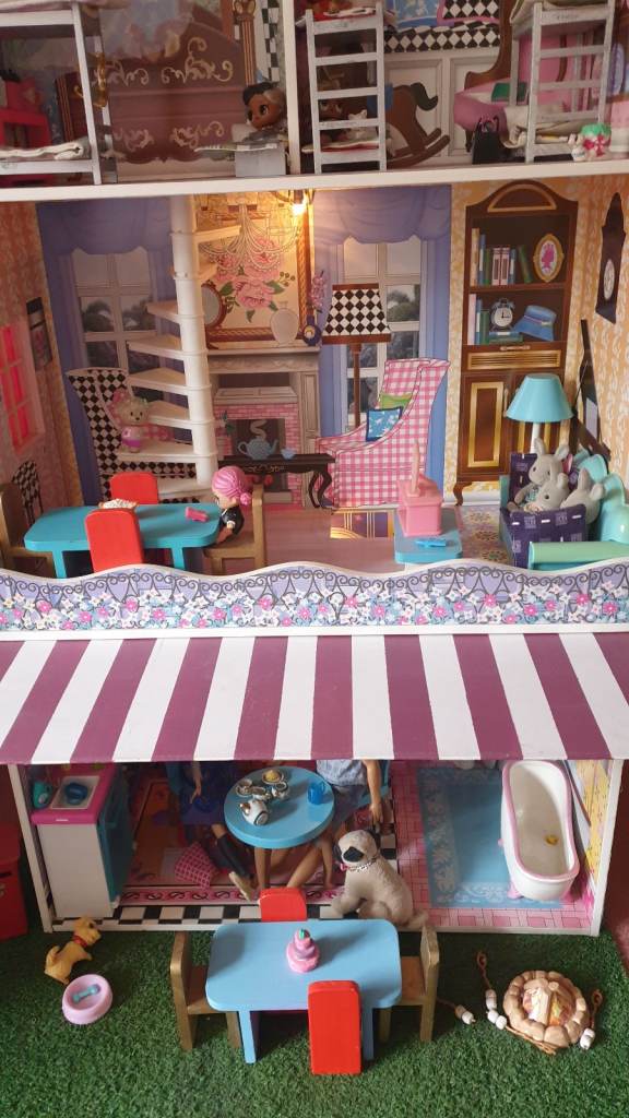 Beautiful imported wooden dolls house with interior lights, retractable awning, 5 × LOL Suprise dolls ( 4 glitter), Anna (Frozen) doll, Barbie Ken Fashionista doll, 3 x toy dogs, 1 x toy cat, furniture including dishwasher, kitchen cupboards, laundry basket, full bathroom furniture- toilet, wash basin, claw china bath, toothbrushes, cutlery and crockery, make believe food, look alike grocery items, 3 x tables, 10 x chairs, fireplace with marshmallows, TV and remote, 3 x toy rabbits, sofa with cushions, coffee table, lampstand, 3 x bunk beds, 1 x single bed, bedclothes, bedroom cupboard with LOL dolls accessories etc all in excellent condition. Collection only from WR6