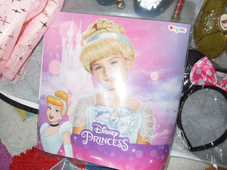 Cinderella wig, brand new in packet, long plaited lovely Elsa Wig with stars, tried on once, Moana wig, worn once, Minnie Mouse hairband with bow and ears, never worn, Belle light up/flashing wand, brand new never used, Cinderella Wand and Tiara, new never used, Cinderella, Snow White and Belle (light up shoes) nice rubber, not plastic, all new and never worn.