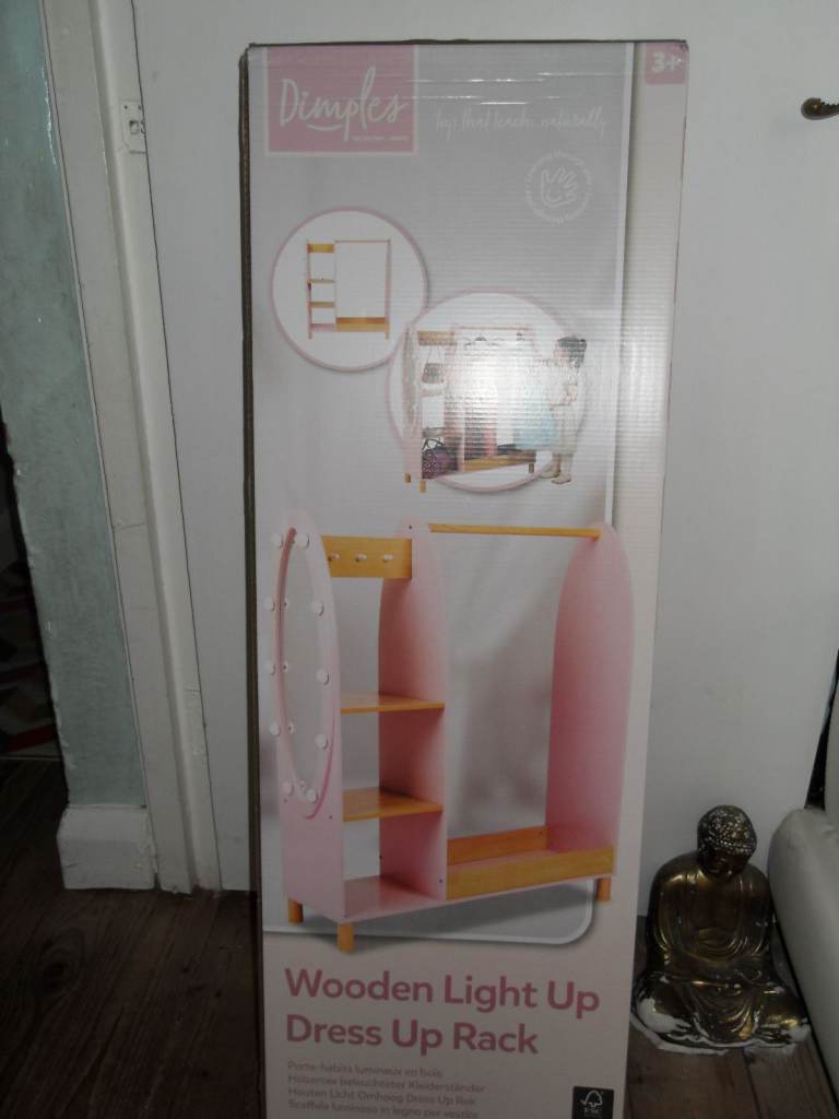BNIB Dimples wooden light up dress up rack is brand new, boxed and unopened, the large bundle of Disney Princess Costumes, all age 5/6yrs, most BNWT and a few only worn once or twice in immaculate like-new condition, also includes various brand new wigs and shoes and other accessories, most bought from either the Disney Store, Disneyland Parks, or other.
