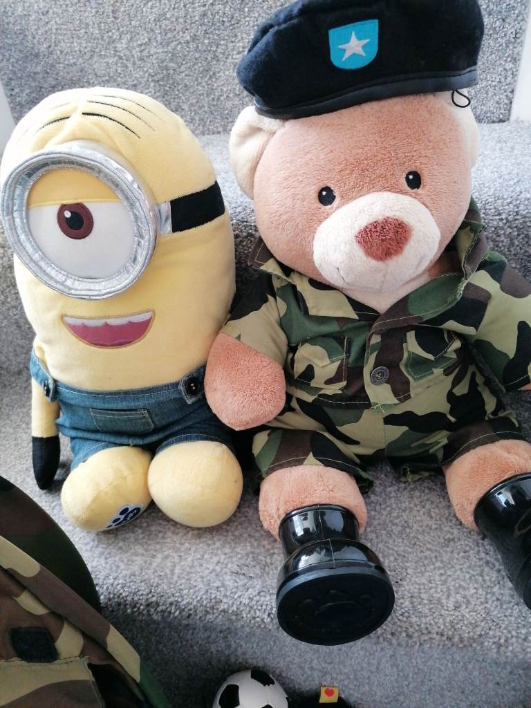 Stuart the Minion, and Teddy bear, army outfit with tent and Chelsea football kit. With box. All excellent condition. From a smoke free home.