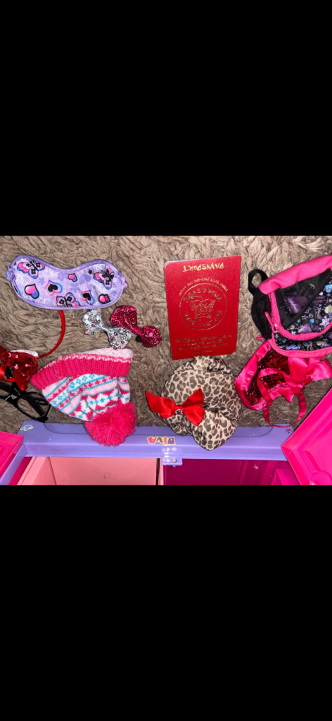 Outfits sparkly dresses white winter boots sparkly boots bunny slippers outfits dressing gown leopard print fleece. Sleep masks, winter hat headband sparkly bag backpacks. Passport phone glasses