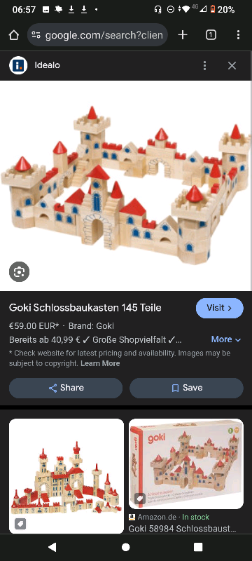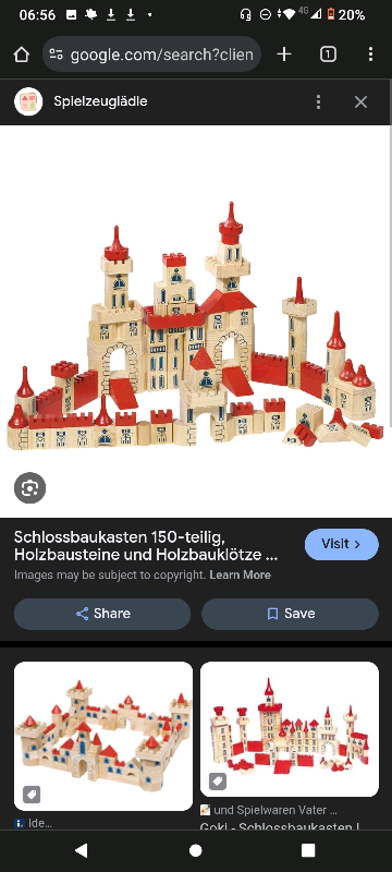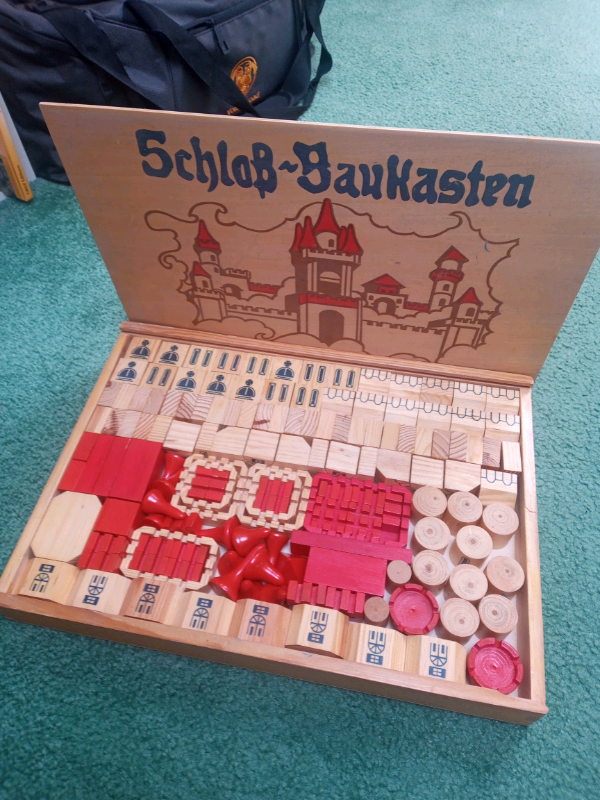 Schloss Baukasten wooden castle construction play set. Approx 30 years old but as new apart from a small chip on case which is visible in photo. Made with lead free paint. Complete with 150 wooden tiles. Suitable for children over 3 years of age. Dimensions of box 415mm x 295 x 45. This currently retails at about £50 and I have seen nothing cheaper than £15 on the used market ( and those are not in such good condition as this). Collection preferred but will post within UK at Buyers' expense.