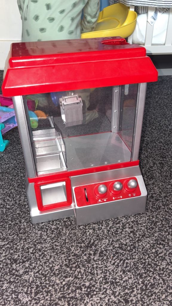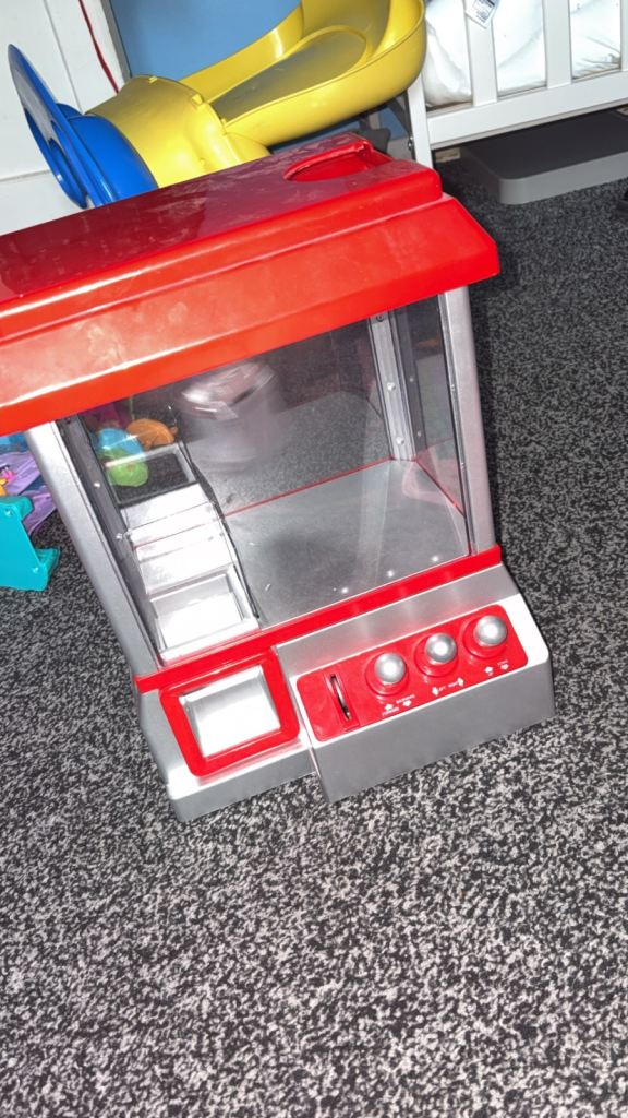 Vending grabber machine you get little plastic coins to slot in (plays music)