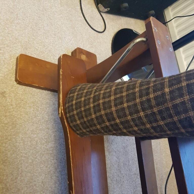 No wear to the material. Wear can be seen on the wooden frame, a light sand a re-varnish can fix this.