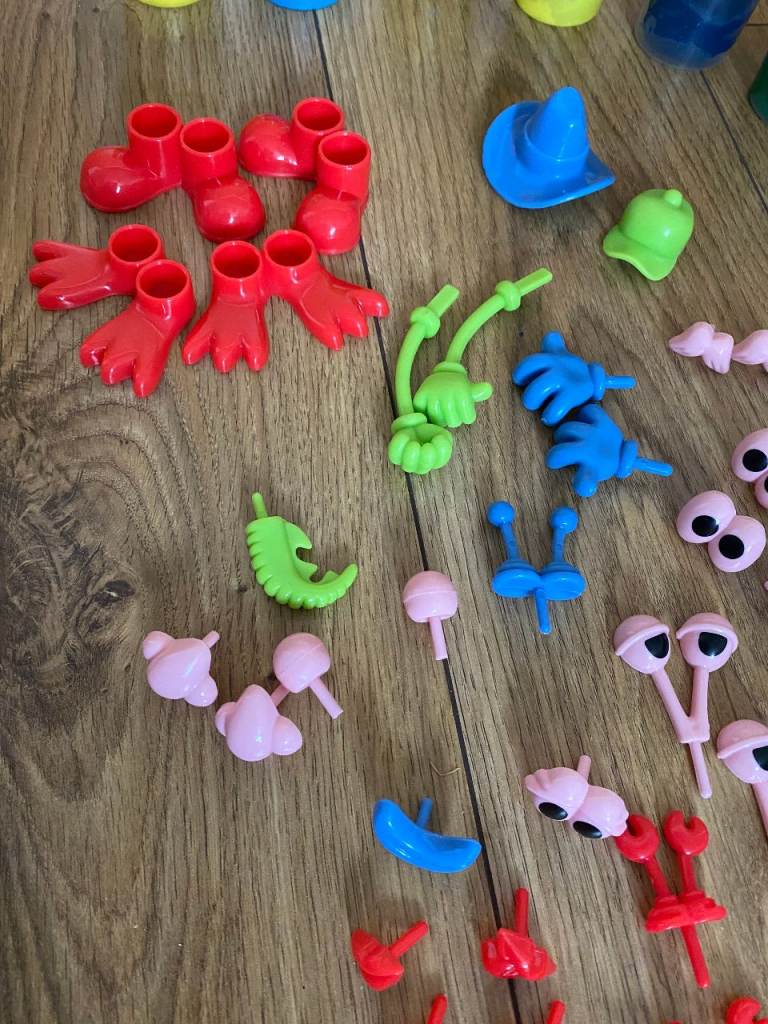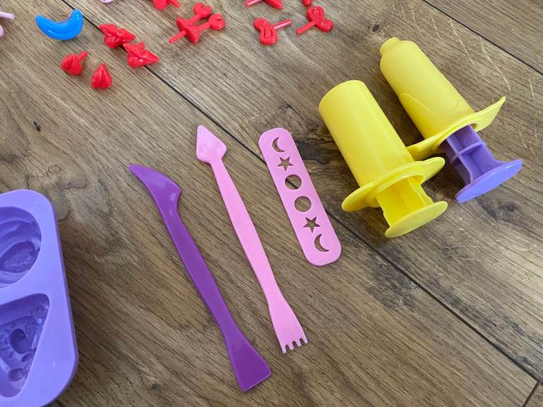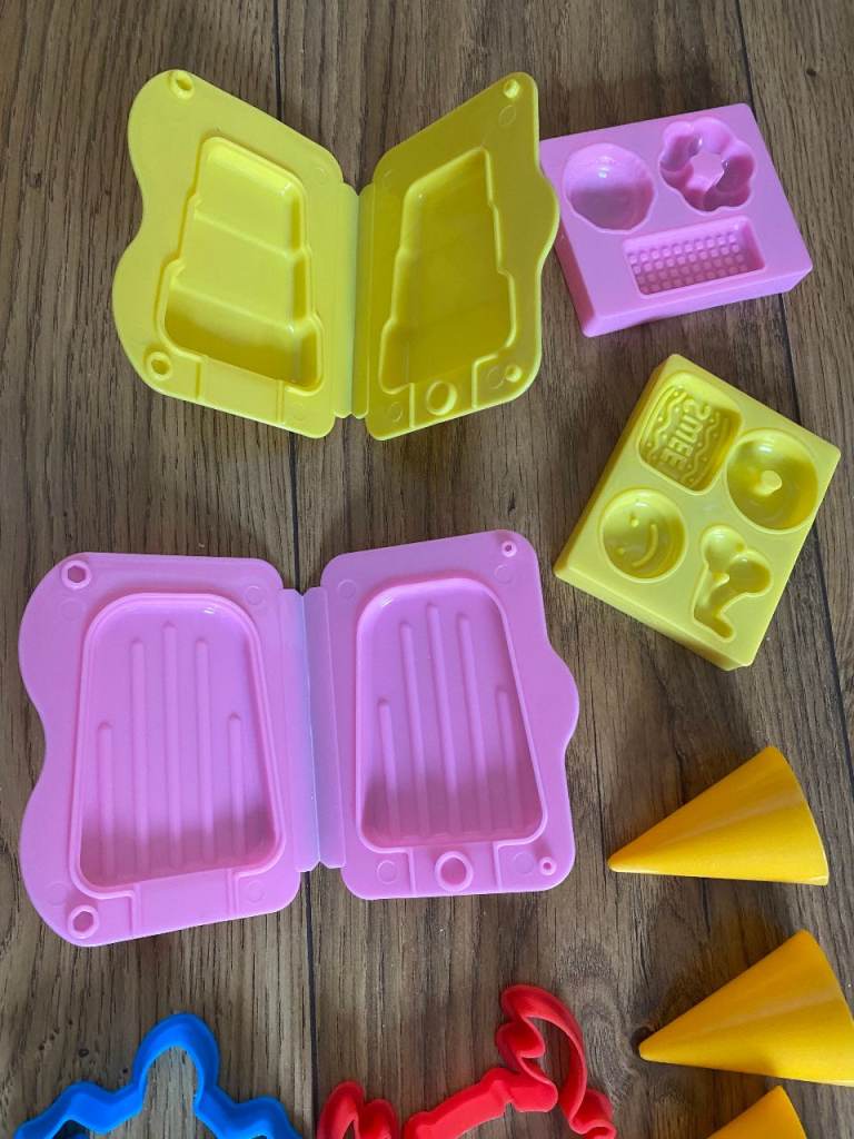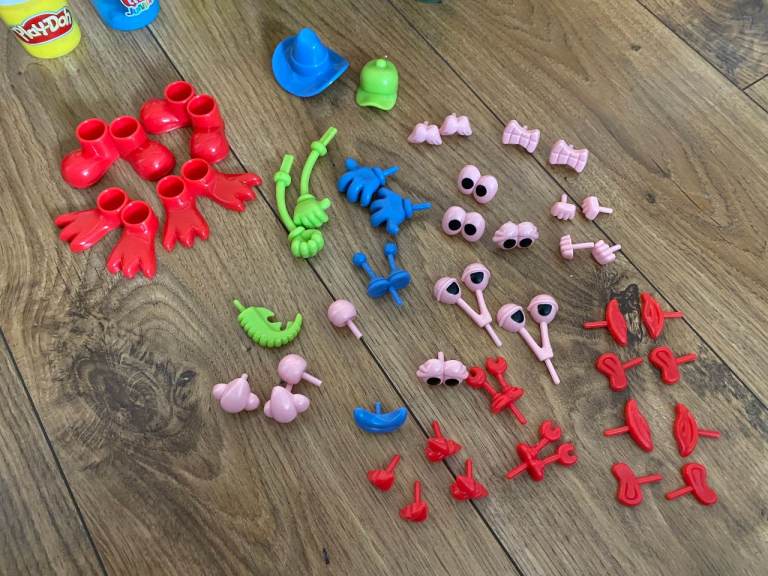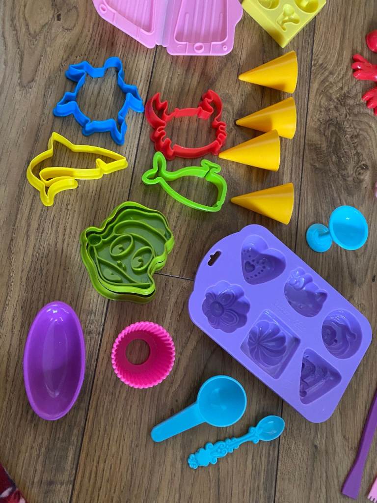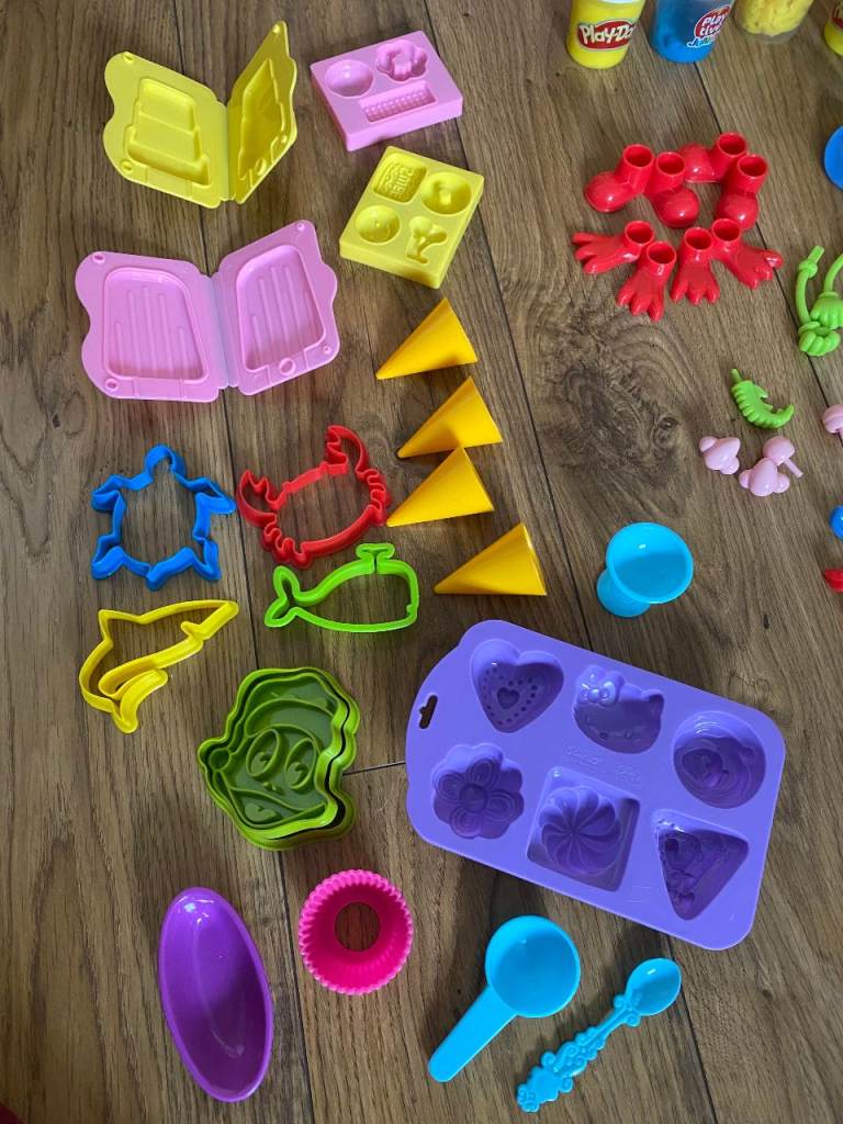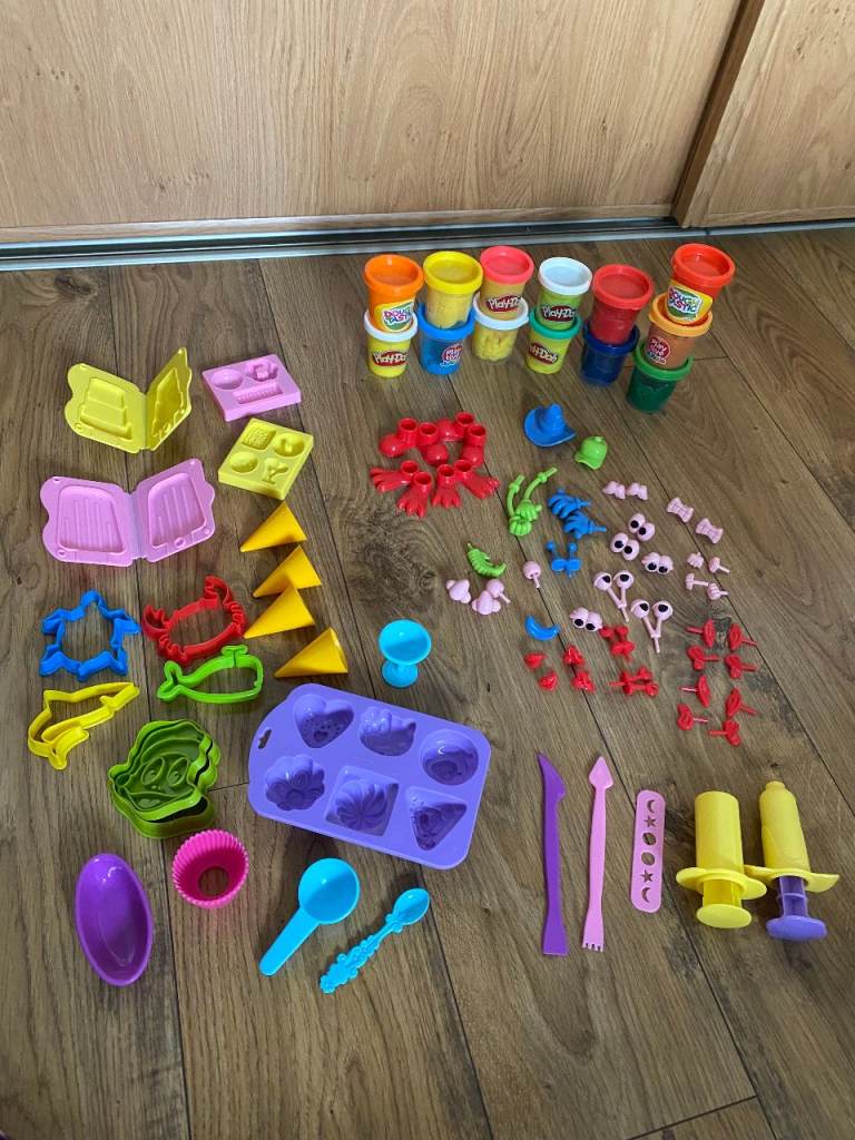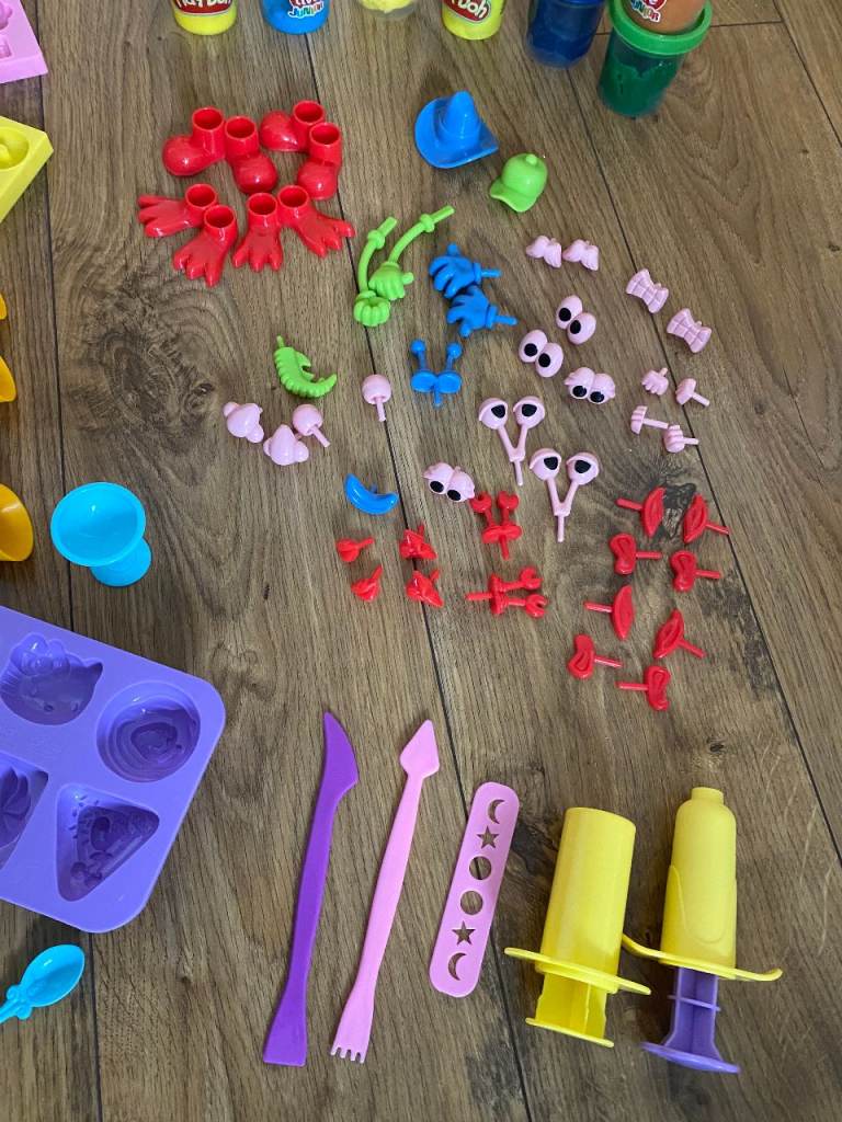 PLAY-DOH, TOOLS & ACCESSORIES : LOTS OF ASSORTED COLOURED TUBS OF PLAY DOH, MOULDS, CUTTERS, TOOLS & ACCESSORIES FOR CREATING PLAYDOH MODELS: EYES / EARS / HANDS / FEET