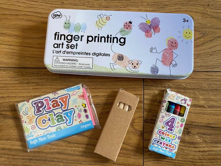FINGER PRINTING ART SET TIN - contains 3 coloured inks, 12 rubber stamps and 10 colouring pencils + instructions (has been opened but not used)