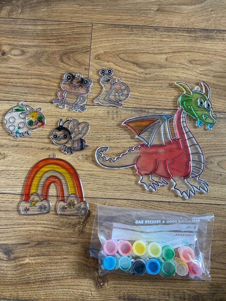 ASSORTED SUN CATCHERS FOR HANGING ON WINDOWS. COME WITH LITTLE PAINTS & APPLICATOR - MOST HAVE BEEN STARTED BUT NOT FINISHED. FUN LITTLE CRAFT FOR KIDS.