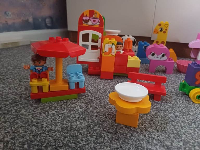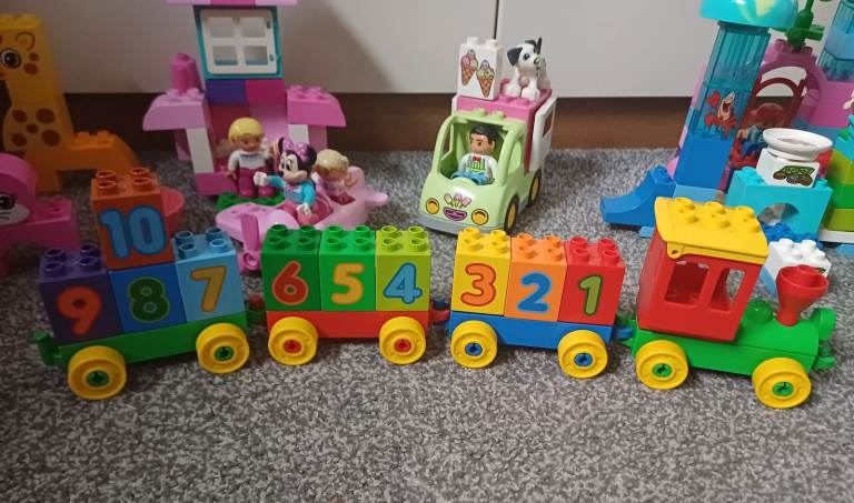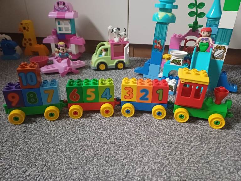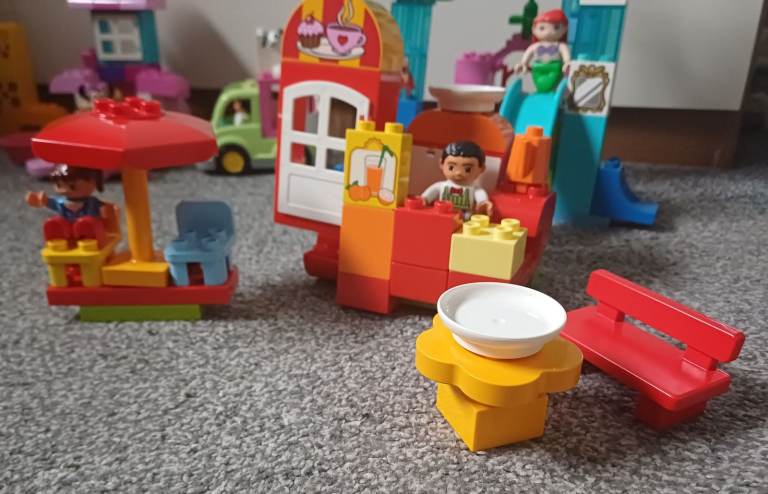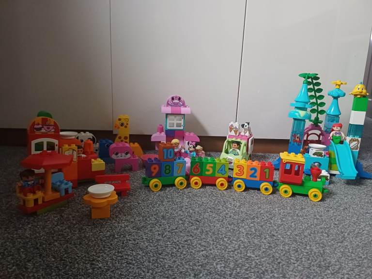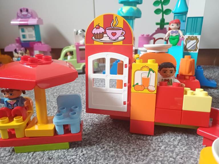 Six sets of Duplo, selling as one lot. Animal set, counting train, cafe, Ariel mermaid set, Minnie mouse cafe, ice cream van. Used excellent condition.