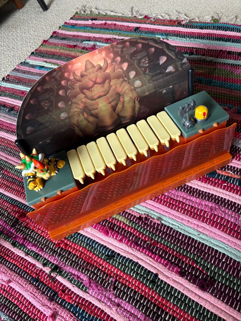 and 8 different rhythms/beats, e.g. jazz, disco or salsa. It also has a detachable music rest with basic music on cards for 4 simple children’s songs to learn to play. It is battery operated and takes 4 size C batteries. About 62cm at widest point. Small repair to the inside base of one side of stand (colour matched). In good, used condition, with plenty of musical fun left in it for other children to enjoy!!!