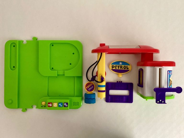 1 x Garage and base, includes shop, petrol pumps, car inspection ramp/lift, 4 sounds horn, car key, engine, car noise.