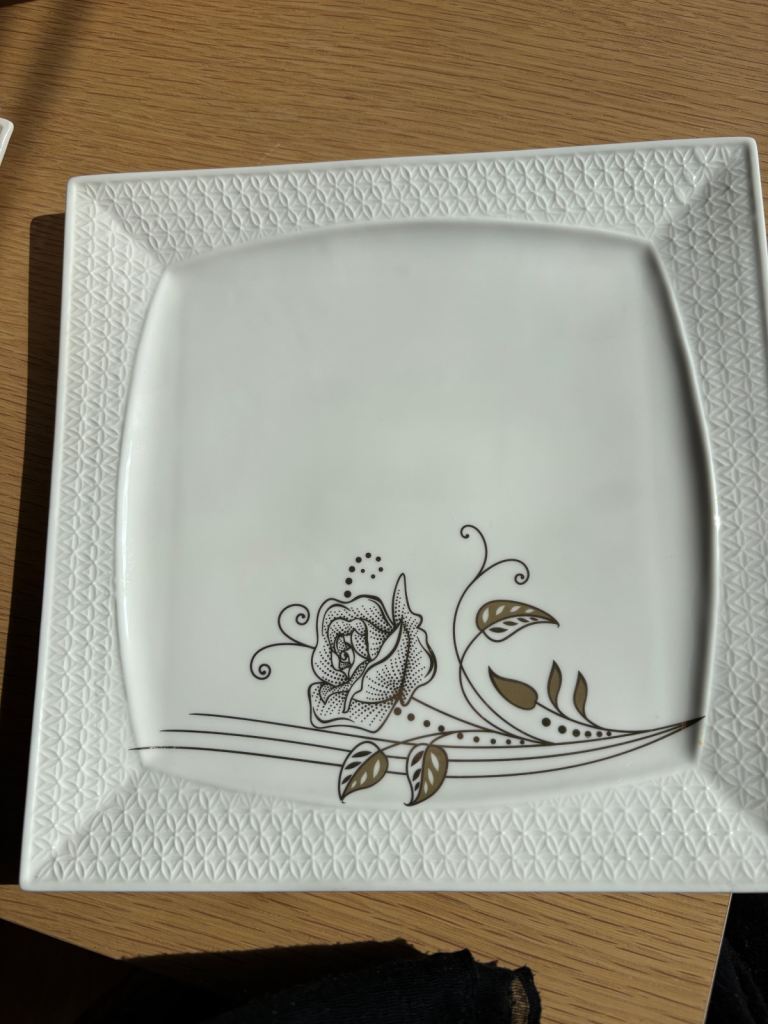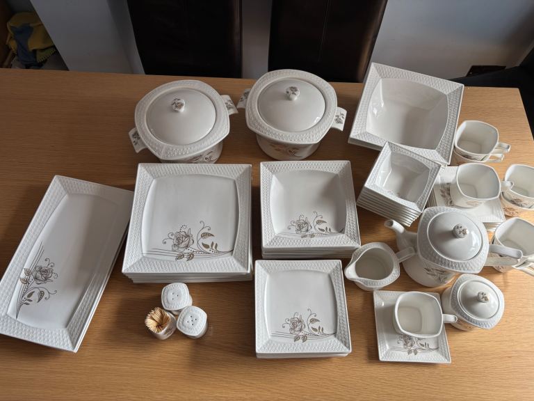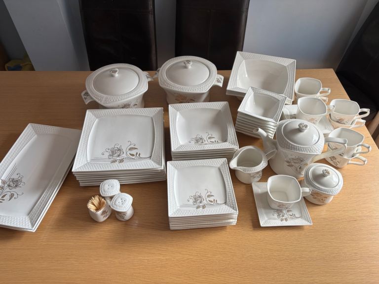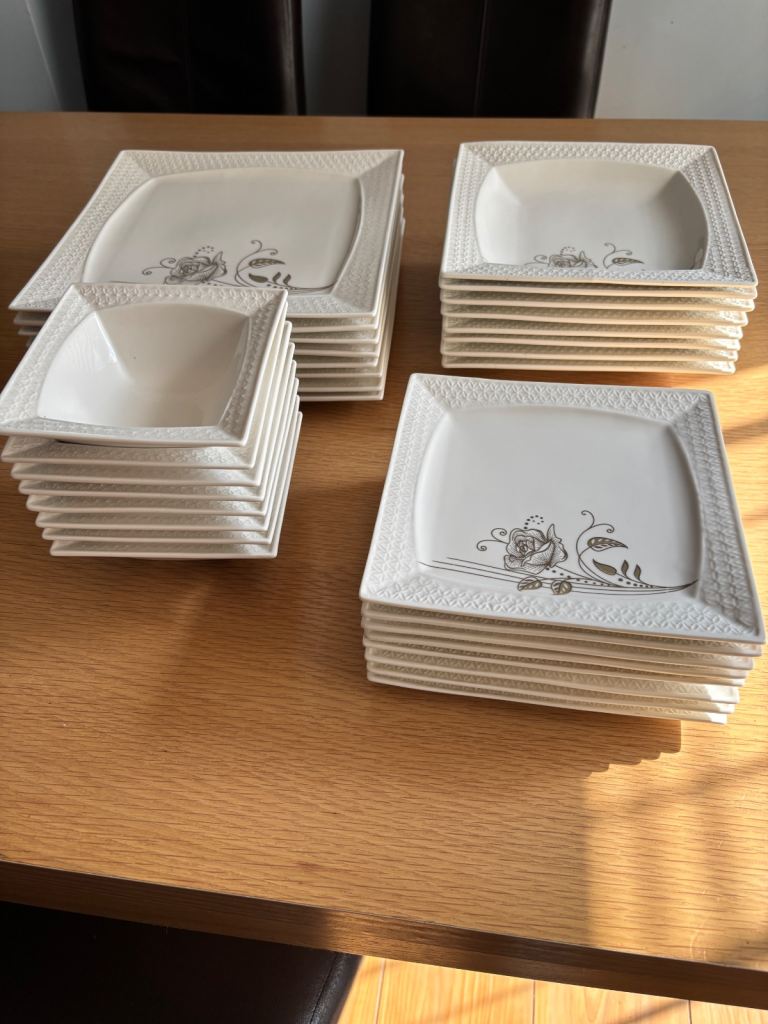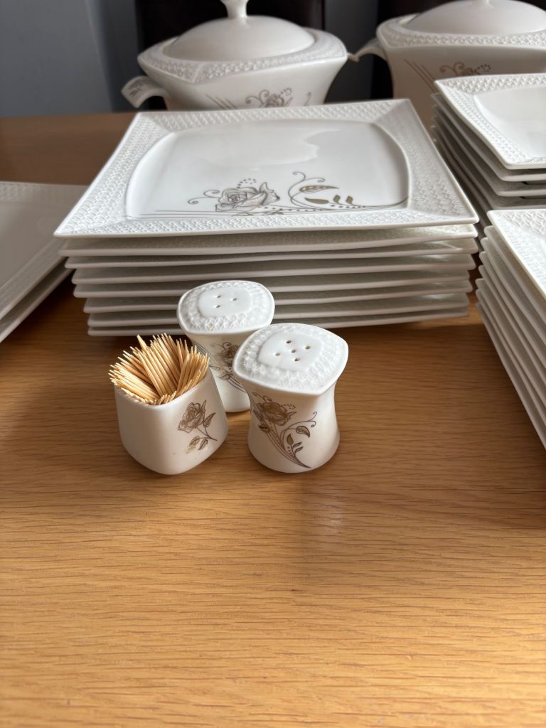 Dining in excellence elegant and practical dinner service. Described as “bone china porcelain”, the modern square pieces feature a textured border and an intricate gold rose on every piece to add that touch of classy elegance. The 60 piece dinner set serves an 8 person setting. The set comprises of: