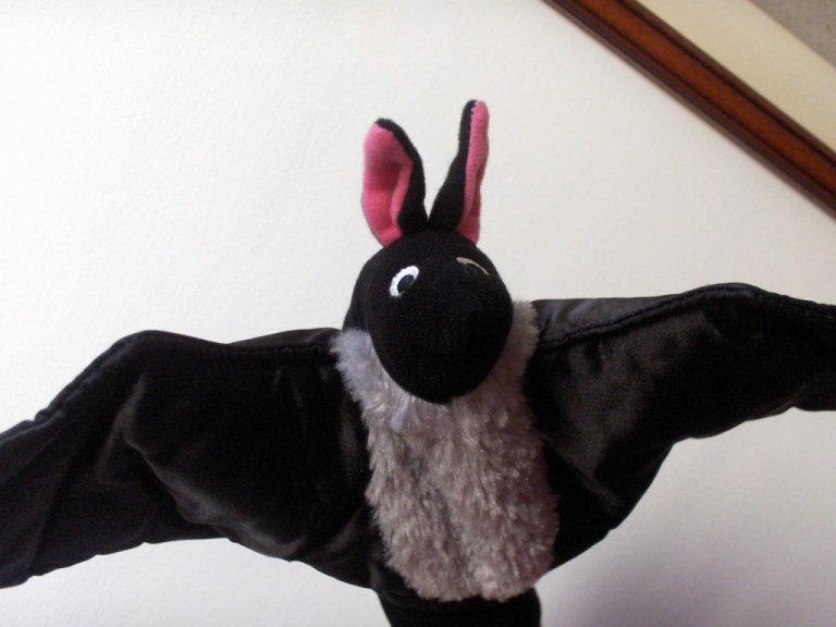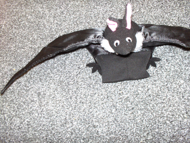 I have two bats who come to feed in my garden at night and I love to stand and watch them swooping high and low as they eat the insects . This hand puppet has a wing span of approx. 44cms and is made of black satin grey fur and pink and black fleece and is very tactile. I can arrange collection from Orpington BR6