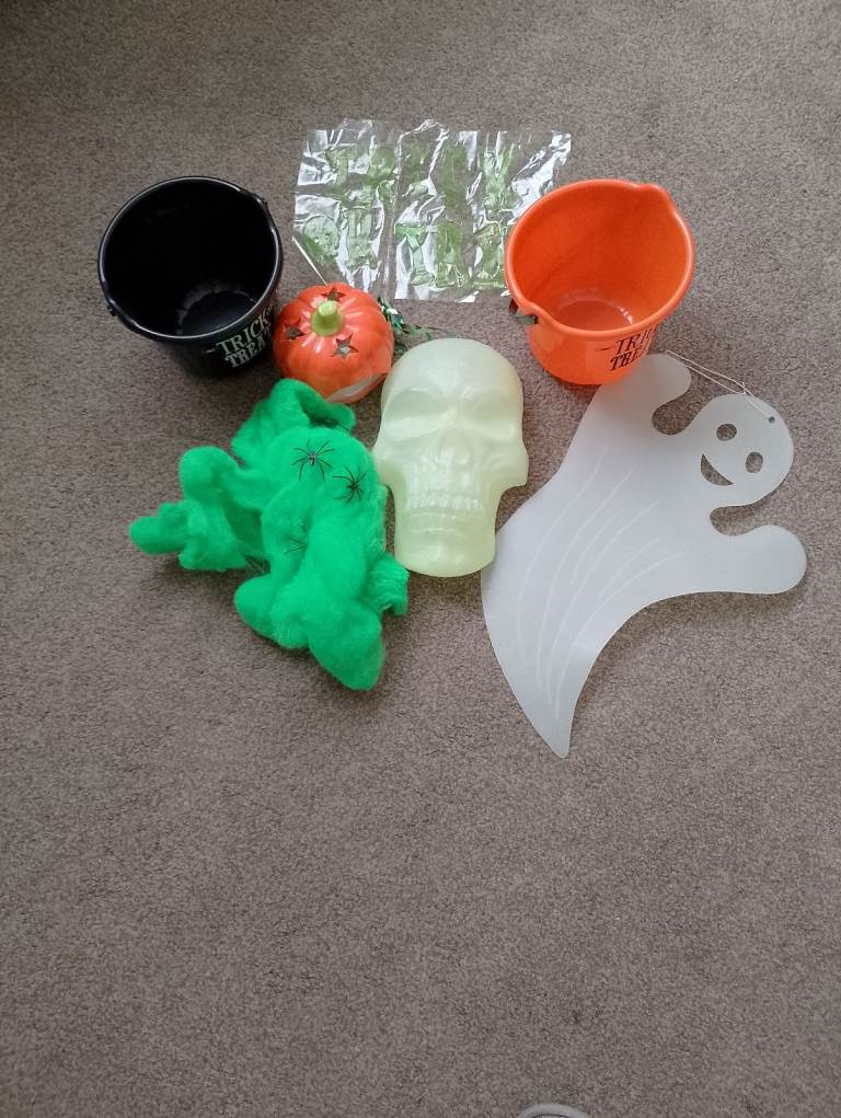 Flashing skull (including batteries), plastic ghost & 2 sweet buckets & fake ectoplasm plus plastic spiders also trick& treat label
