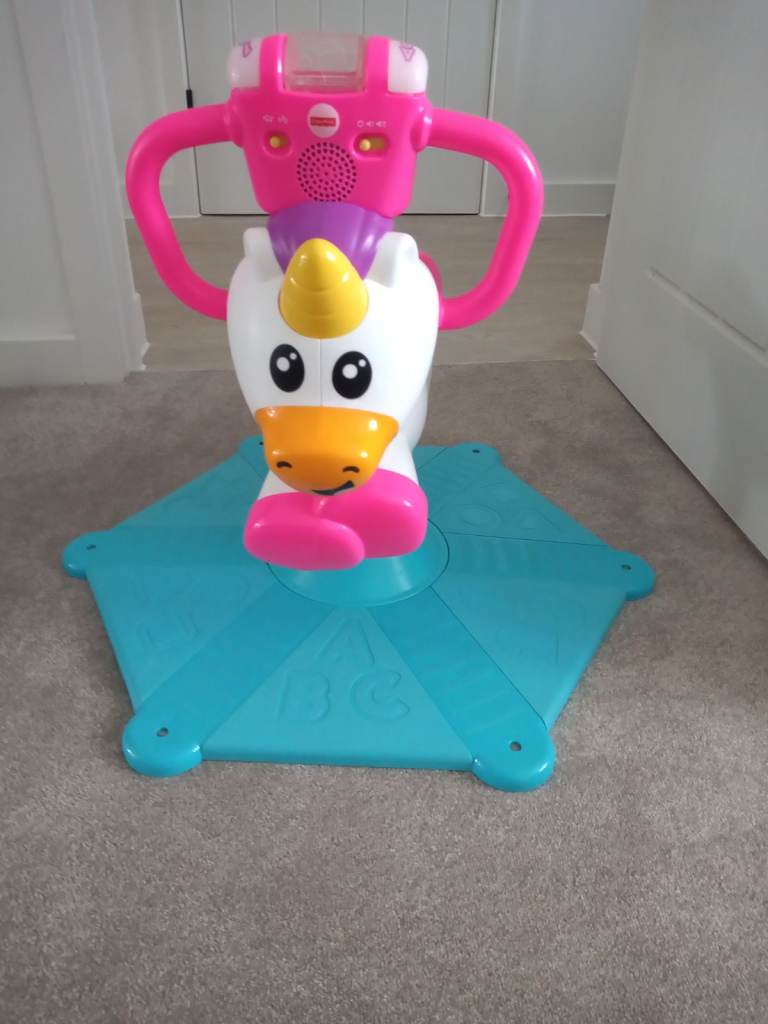 Unicorn sit and bounce talks and sings plays music and educational content as it bounces or spins 360 degrees. Two ways to play, learning and music modes