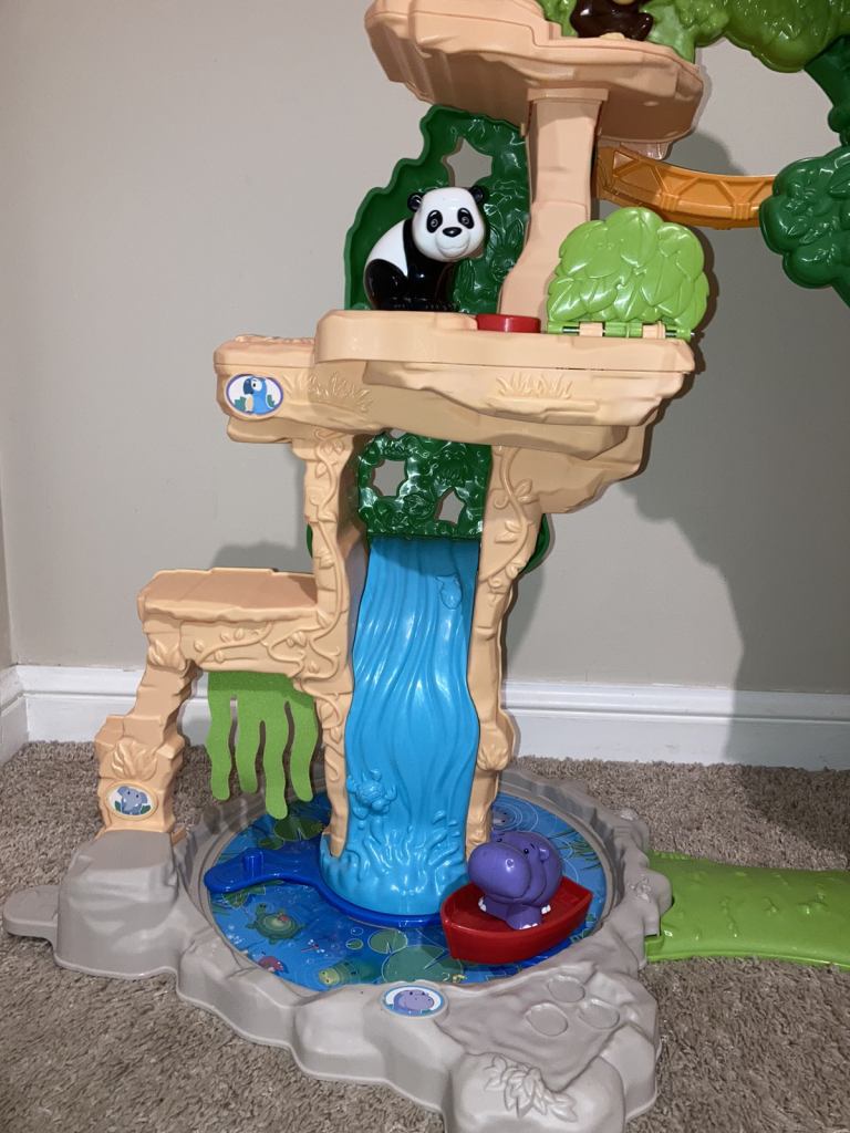 Pop-up computer screen with animal facts, working zipline, drop-through waterfall, peek-a-boo bush, plus soft vines and spinning river