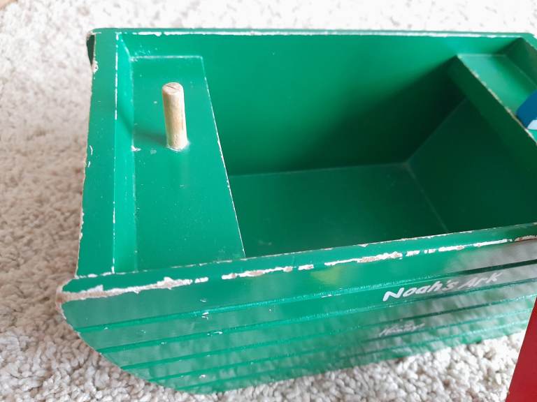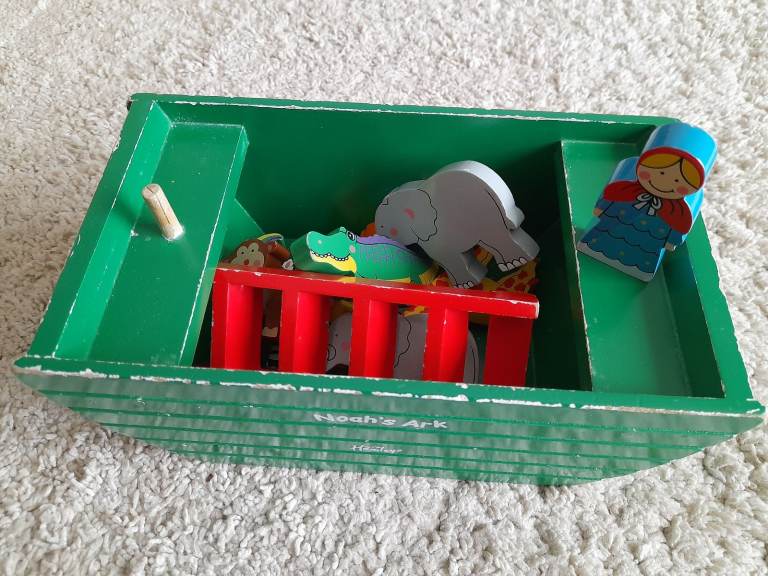 Pre-loved wooden Hamleys Noah's Ark with Mrs Noah, ladder and animals (including some random additional ones pictured separately!). The roof lifts off for easy storage of parts.