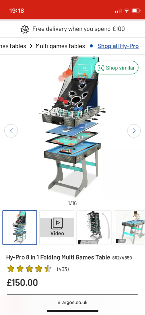 Includes table football, pool. Dimensions as per advertised on Argos website. Buyer to uplift.