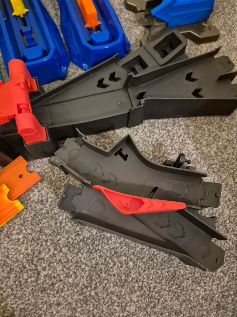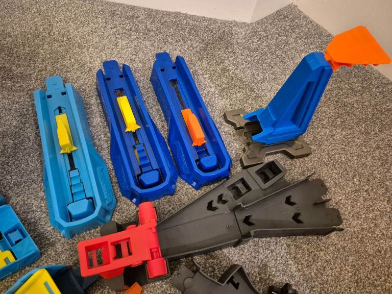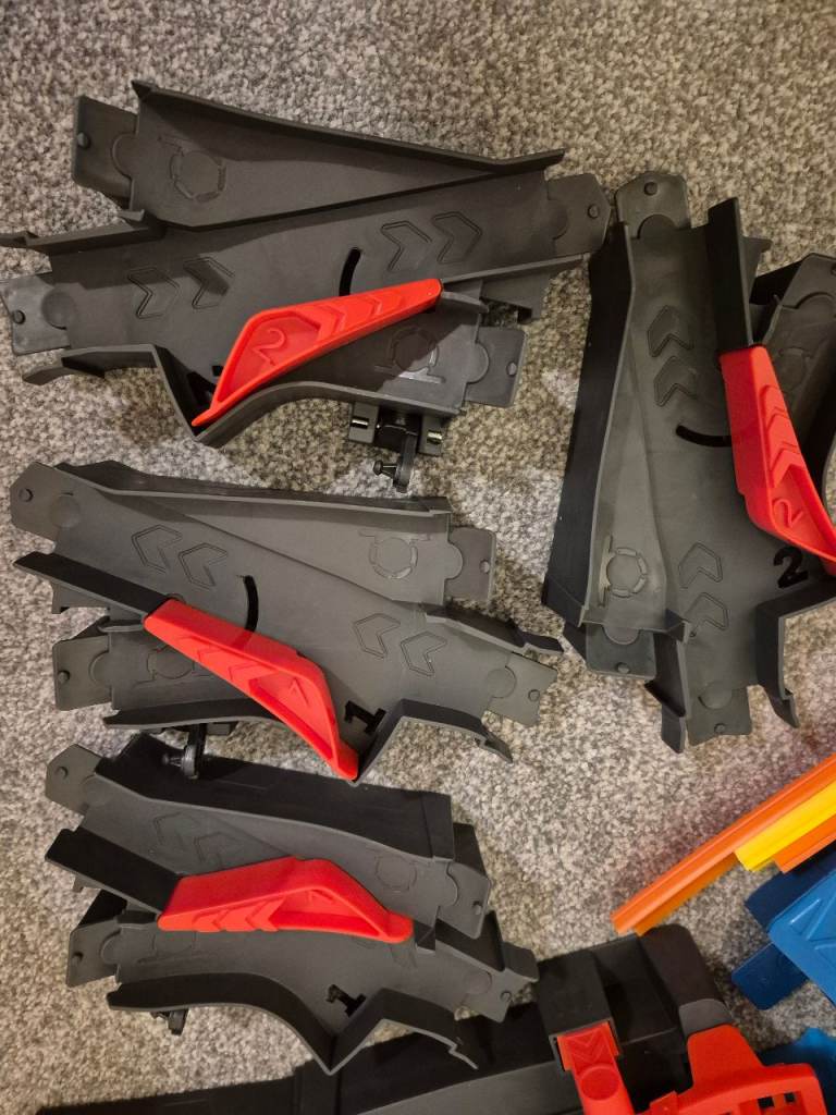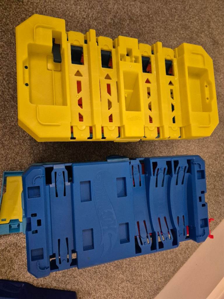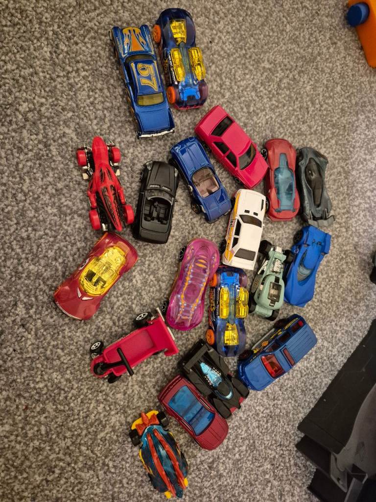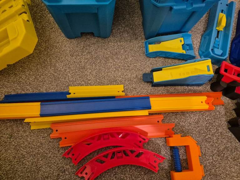 I have a lot of hotwheels, track, connectors, interchange connecting parts and 24 cars. The 2 tubs which are full of parts can also be used as the track can be attached as the photo shows to make ramps. It has the track to make a loop the loop. All in excellent condition, not played with that much as been stored at a 2nd home. Cost over £220 new so a bargain at £50