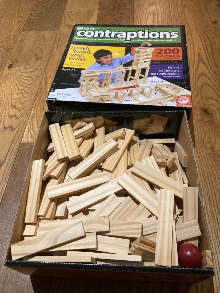 Building wooden blocks activity toy ( similar to Kapla), hours of creative fun for any budding young engineers. 200 pine planks and 2 Keva balls.