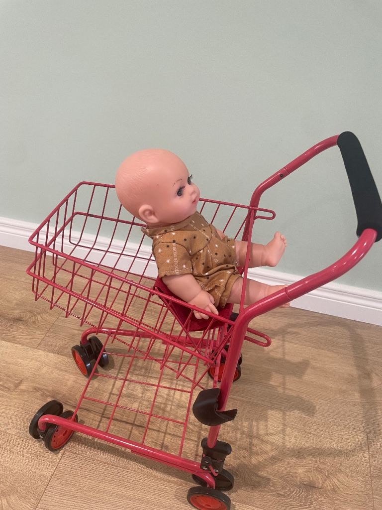 Shopping trolley for pretend play. Holds a doll in front seat.