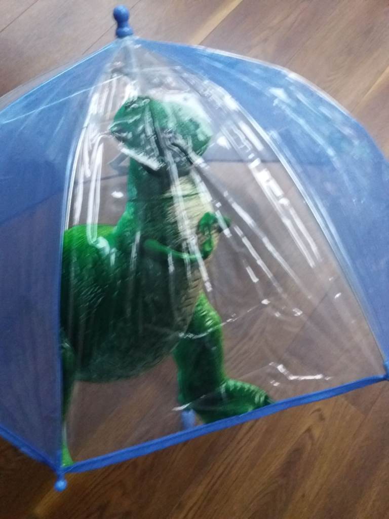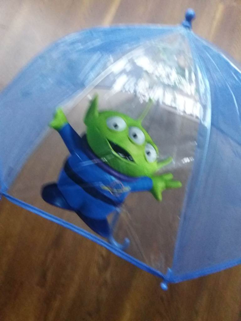 Transparent umbrella with designs of Toy Story characters.