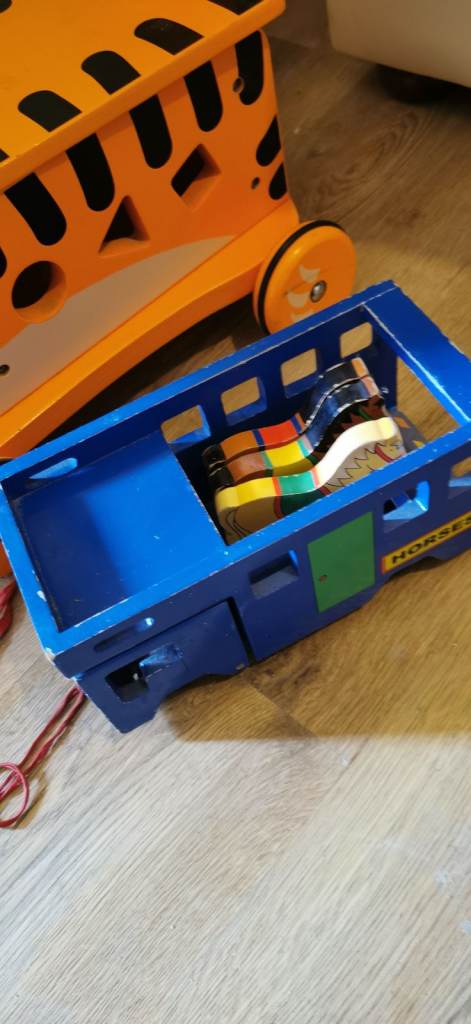 Kids wooden rid on tiger & pull along horse truck carriage