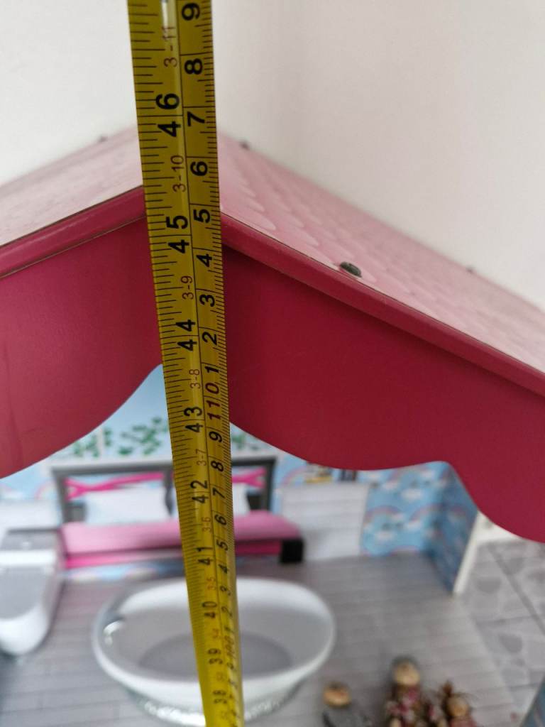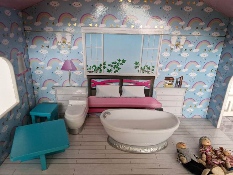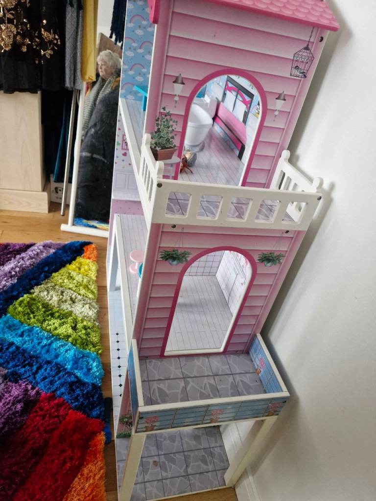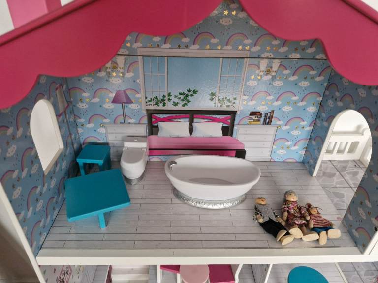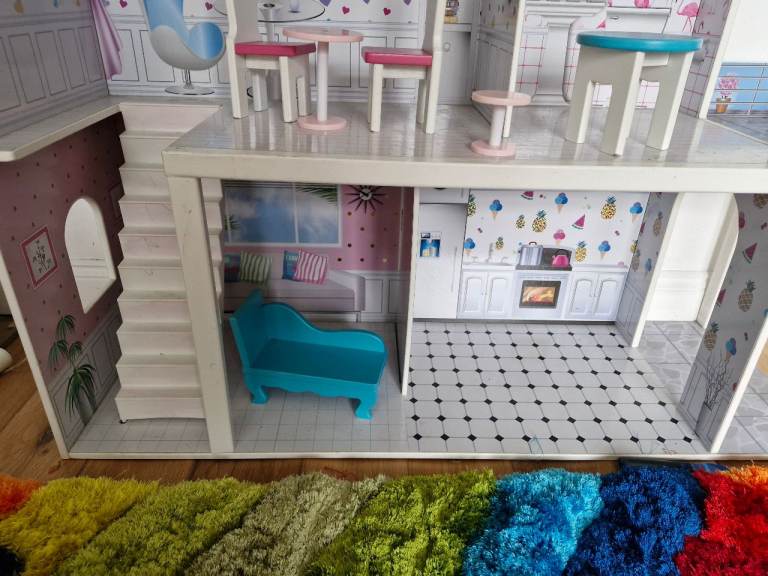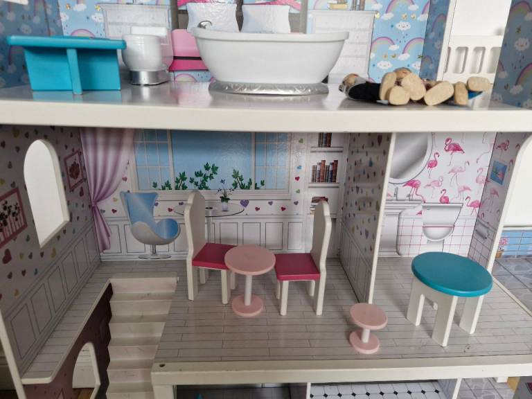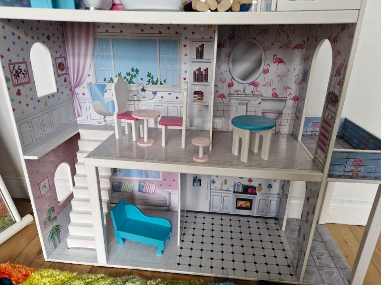 Large Dolls house in good condition around 36inches wide by 46inches tall, has some furniture and dolls as seen in pictures.