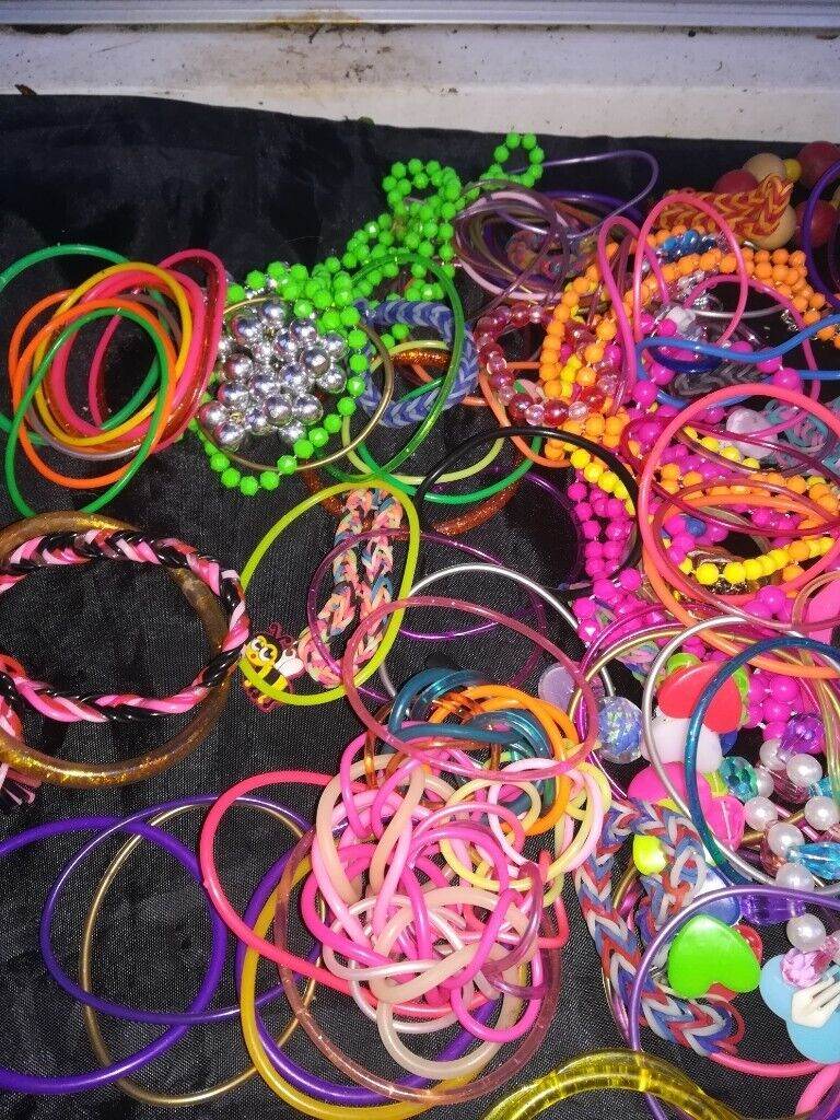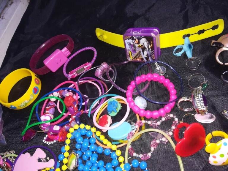 A nice large job lot of mixed childrens jewelry including bracelets, bangles, rings, earings watches & necklaces.