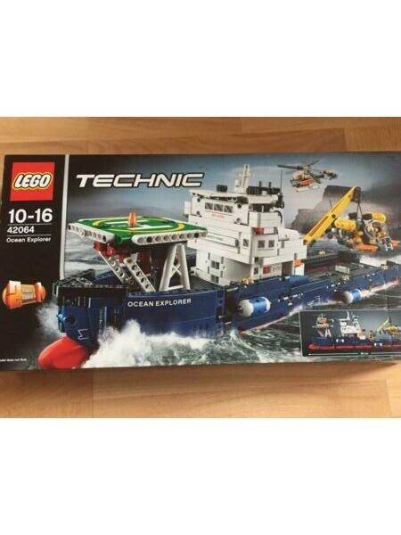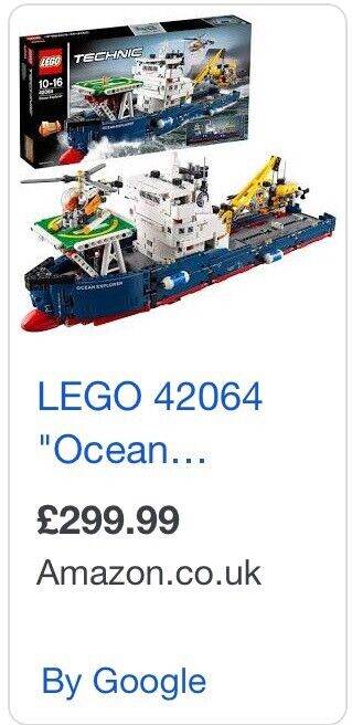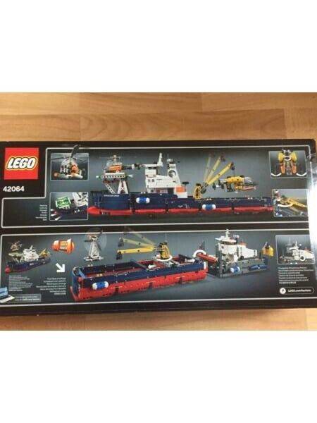 Features a ship with a bulbous bow, large captain’s bridge with radar and funnel detailing, landing pad and a working crane, plus a buildable submarine and helicopter.