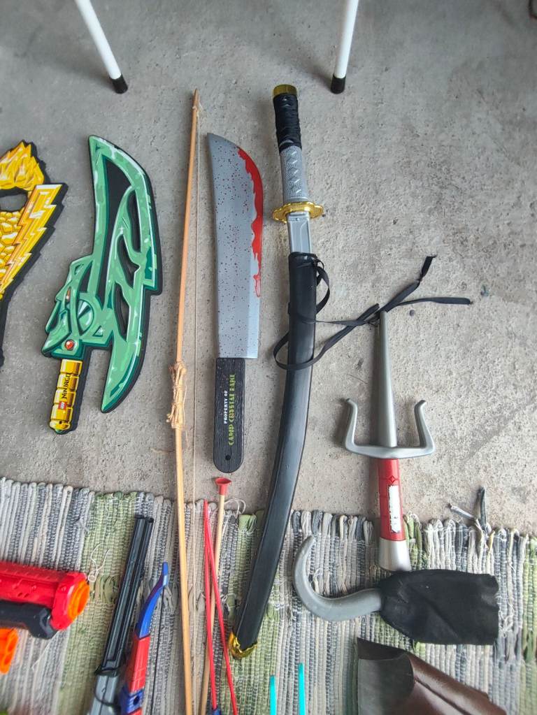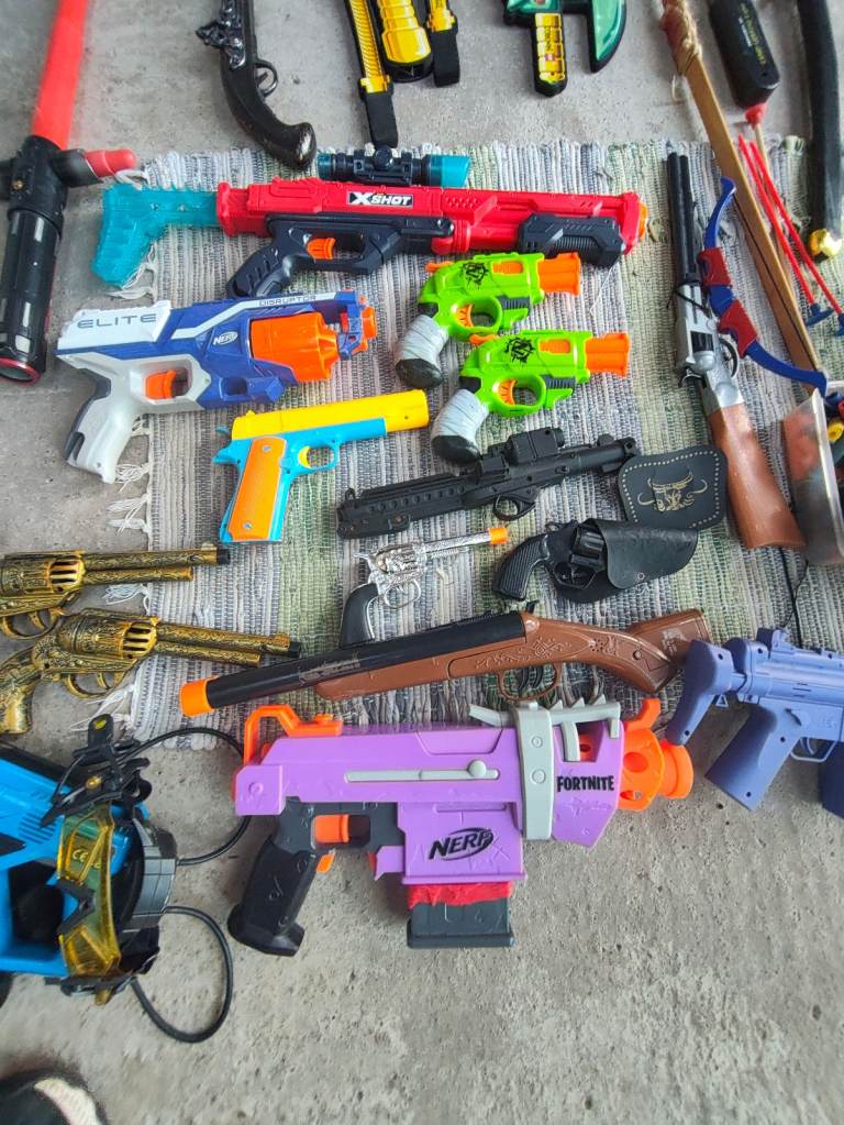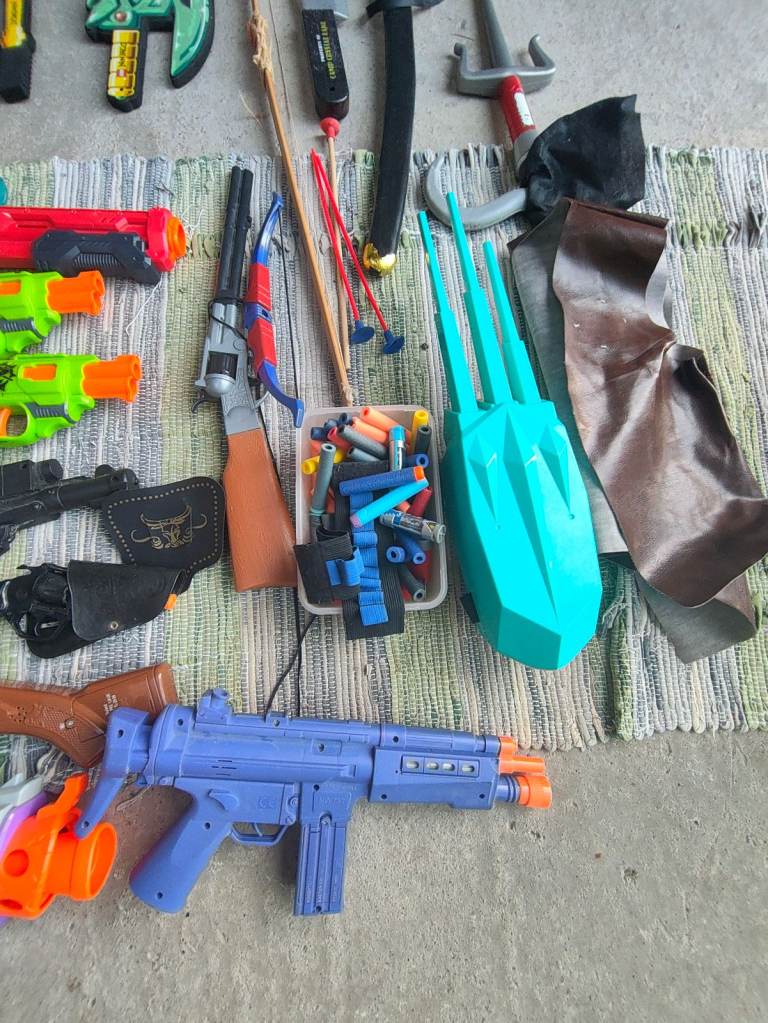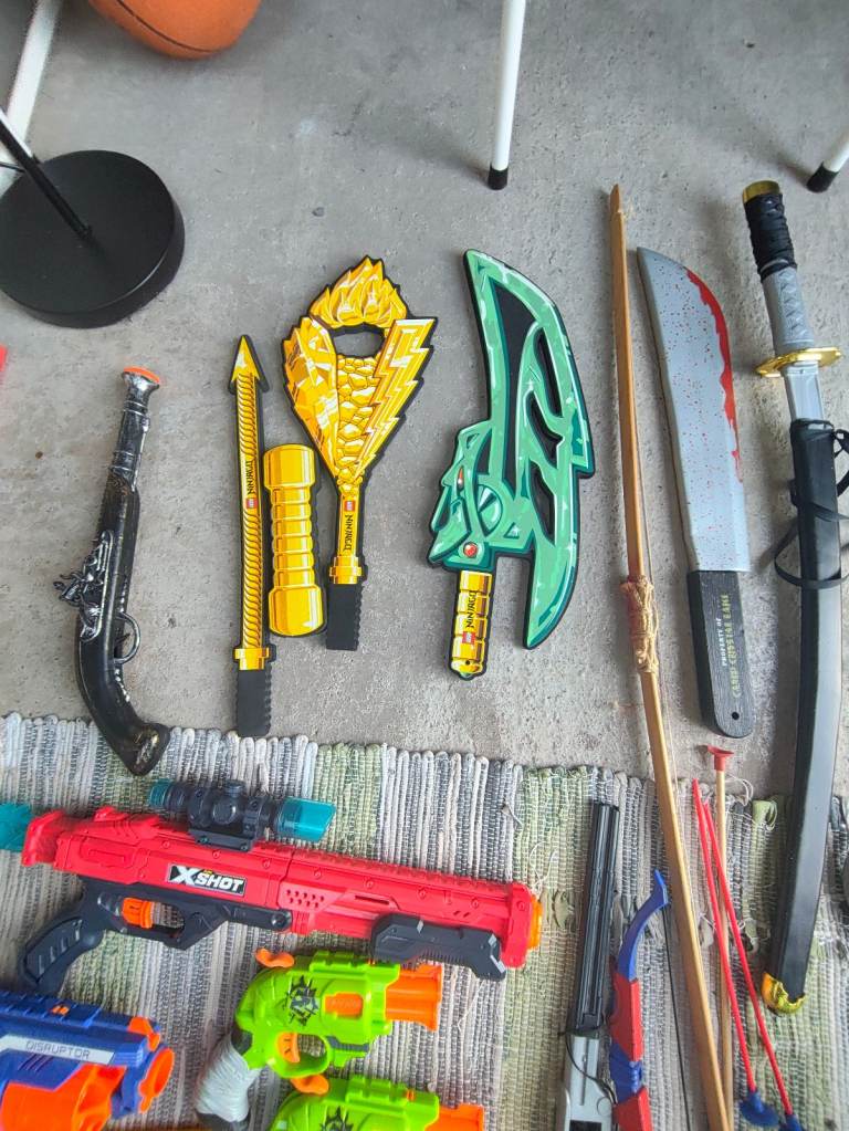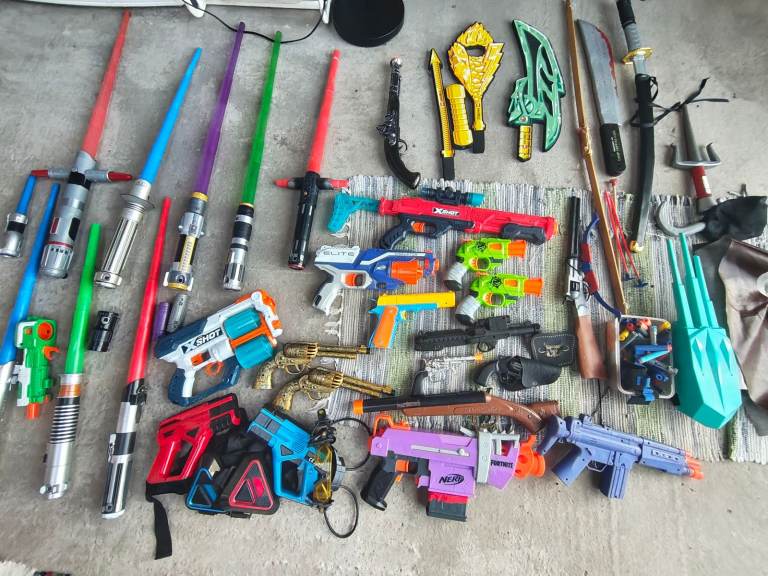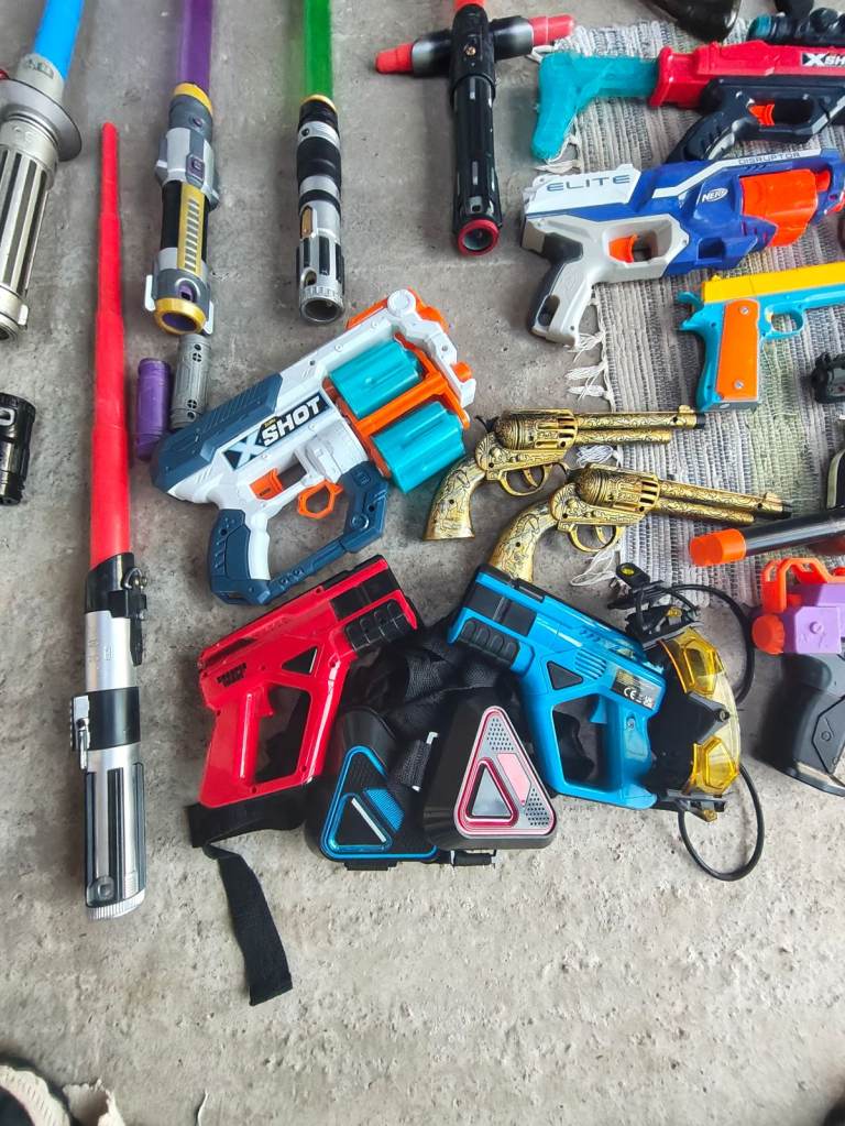 A bundle of toy weapons ( about 40) including Light saber, laser tag, guns and swords .
