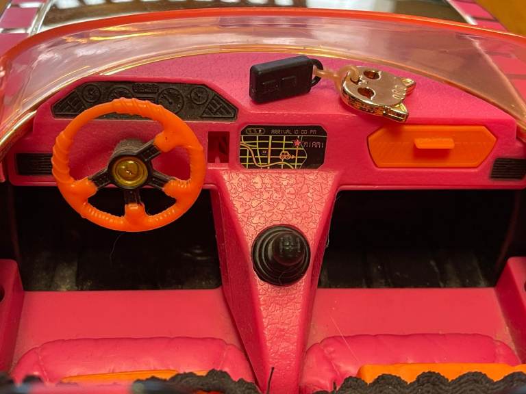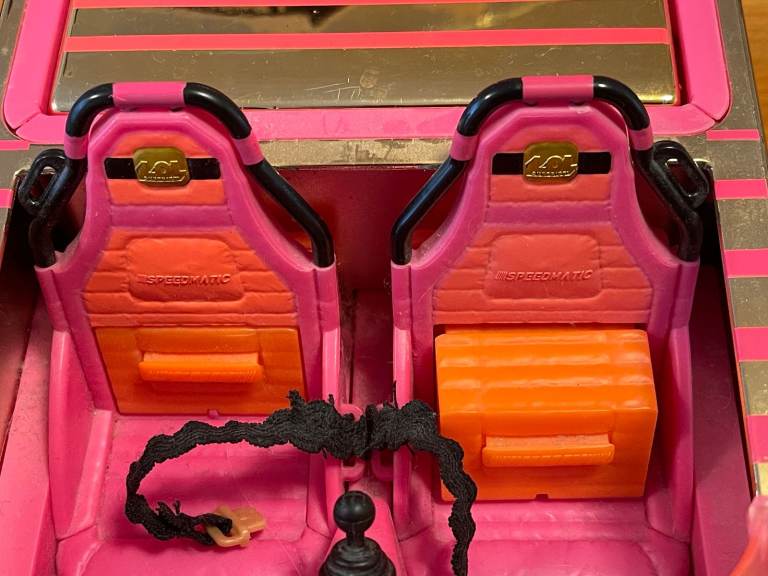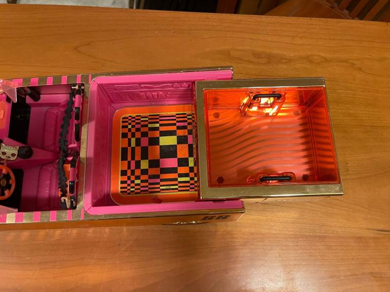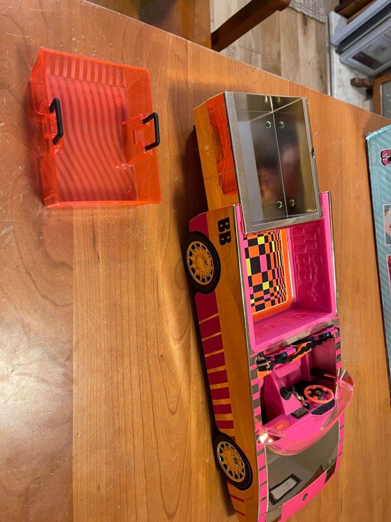 The back converts into a pool and dance floor. The pool has a liner that can be removed for filling the liner with water, and for cleaning it afterwards. Many sizes of Lol (OMG) dolls can fit in the pool area. The seats are adjustable to fit OMG dolls as well as Lol (and tween dolls). Seatbelts are included to keep everyone safe. The glove compartment opens. There are keys for the ignition and pop out side mirrors.