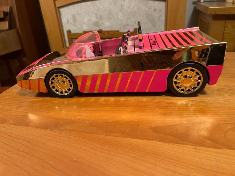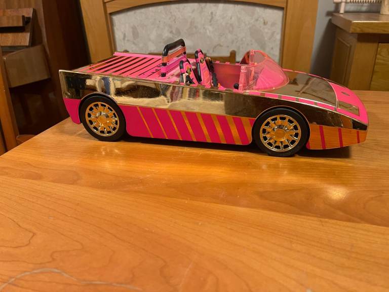 L.O.L. Surprise! Car-Pool Coupe has a luxe rose gold finish with glam pink details. Press the headlights and they pop up, then press the gear shift and they turn on.