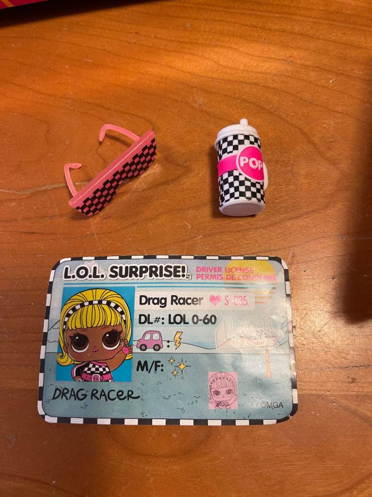 Racing girl Lol doll with car keys on a cat charm key ring, special drinks cup water bottle holder for the car, water bottle, sporty sunglasses, dress/racing suit and shoes. Some of the colors in the doll's clothing change when in contact with water (either cold or hot, you can discover this with your child in the coupe's pool).