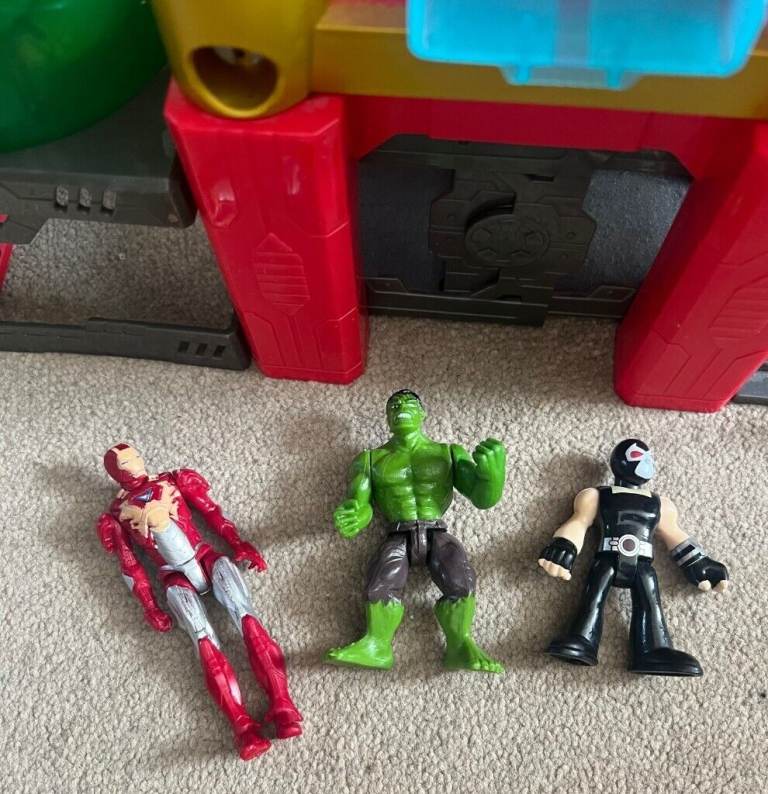 Marvel Imaginext Iron Man (lights up) £15, DC Imaginext Joker £11, DC Imaginext Penguin £11, both are large buildings. Five assorted figures in total. Collection only