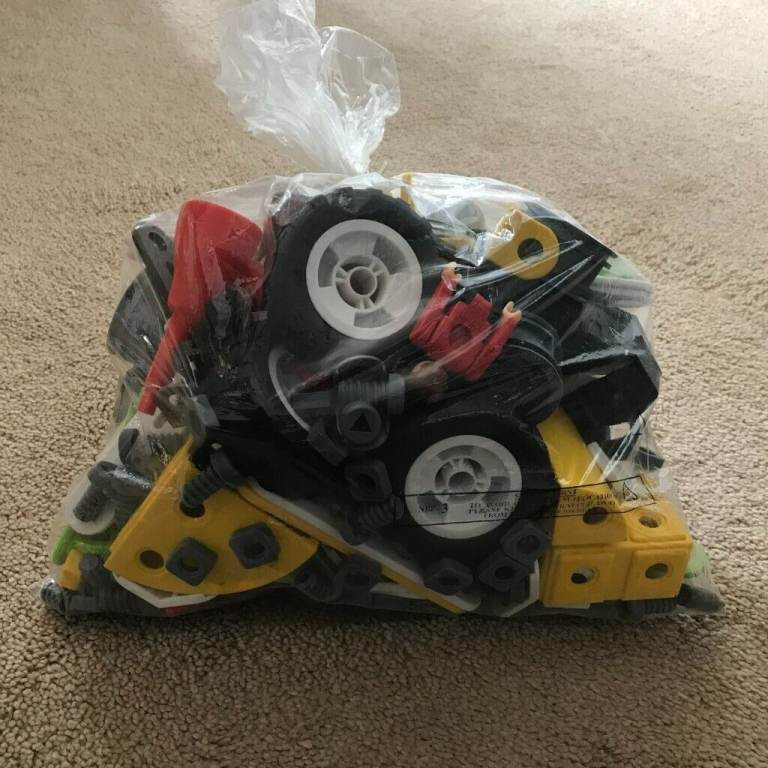 Bag of plastic meccano . Various coloured and shaped pieces -rectangular, triangular and square plus wheels ,screwdriver , bolts and screws. VGC .