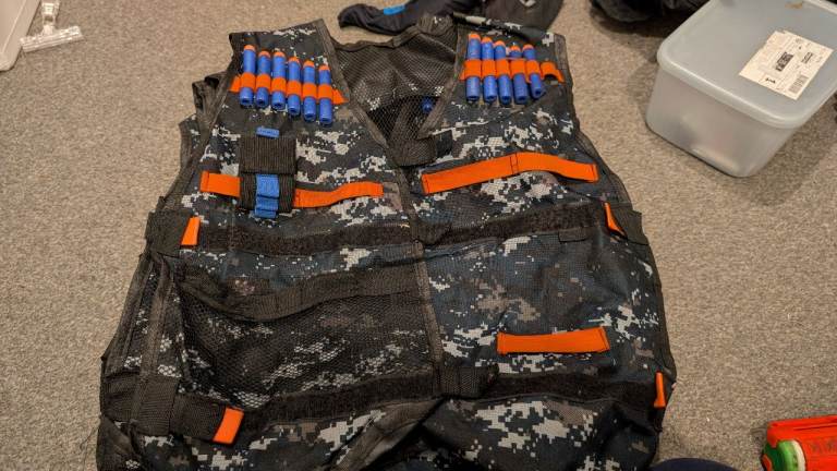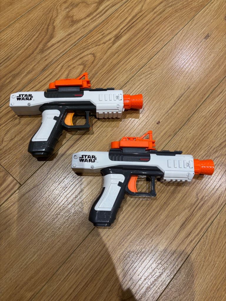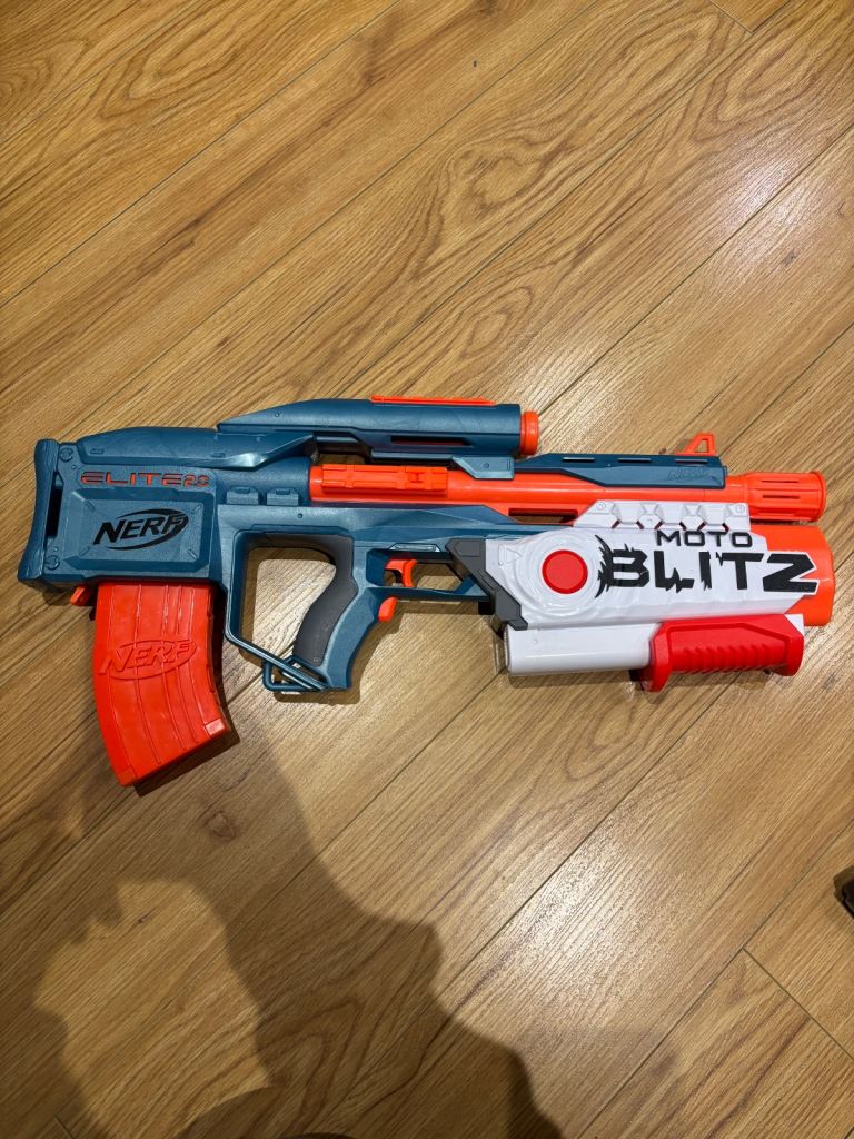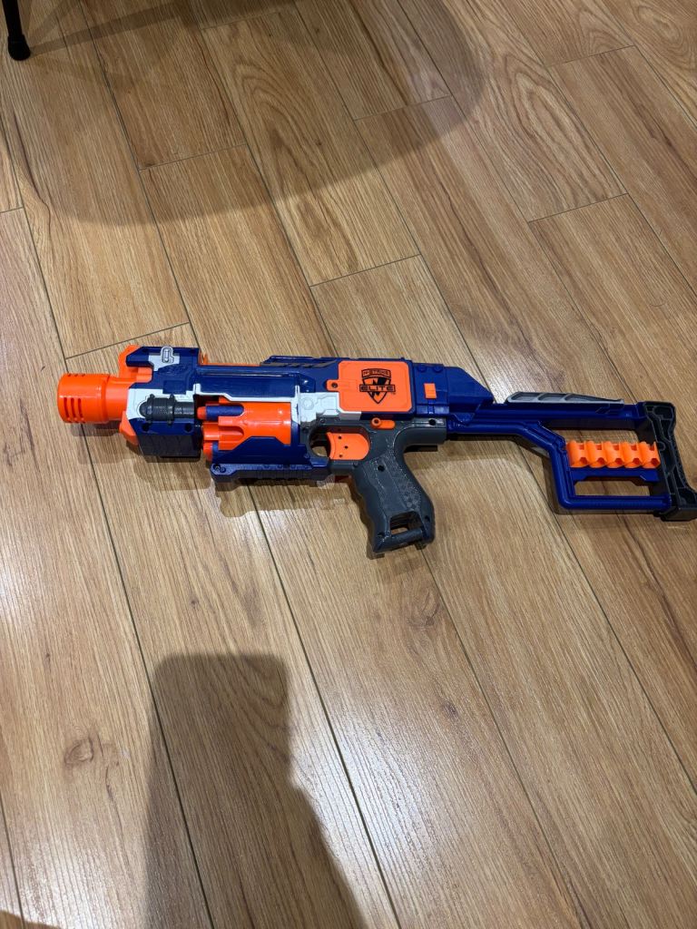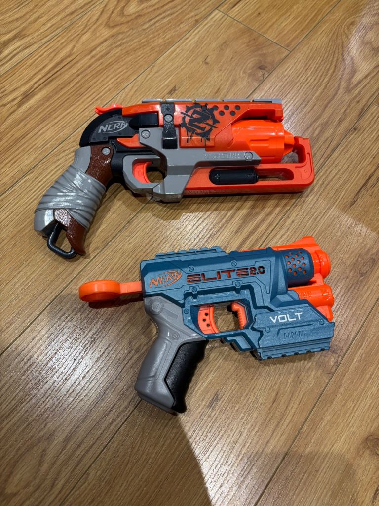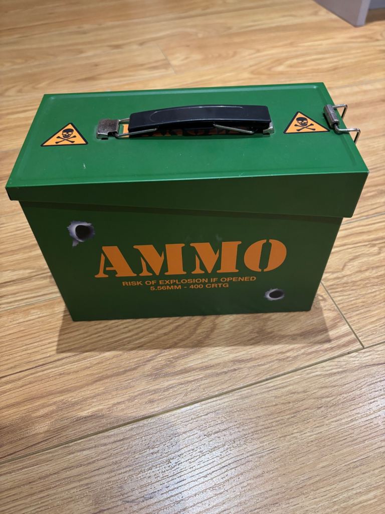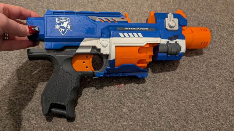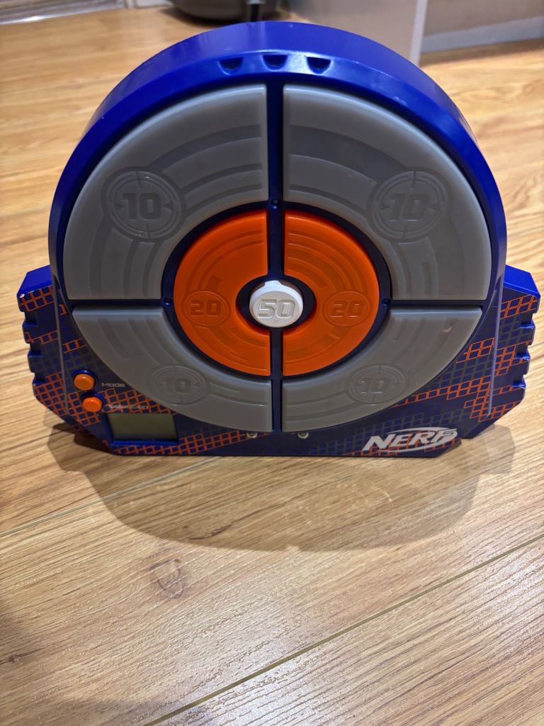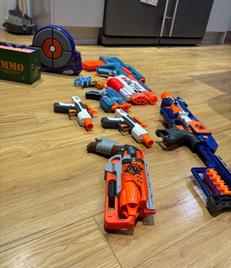 Lots of different sized nerf guns, nerf electronic target and LOTS of ammo! A full tin and more!