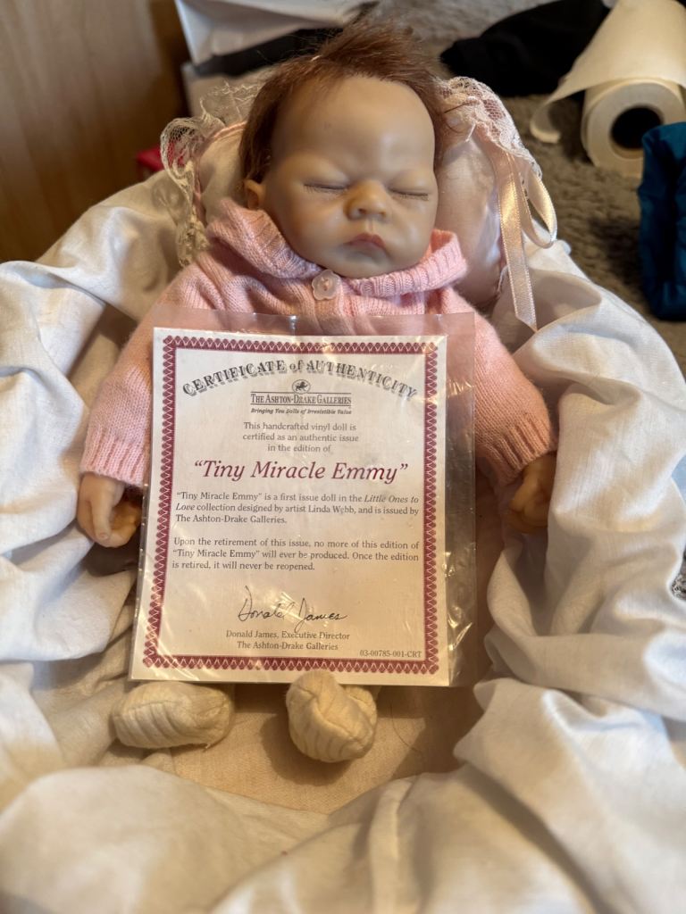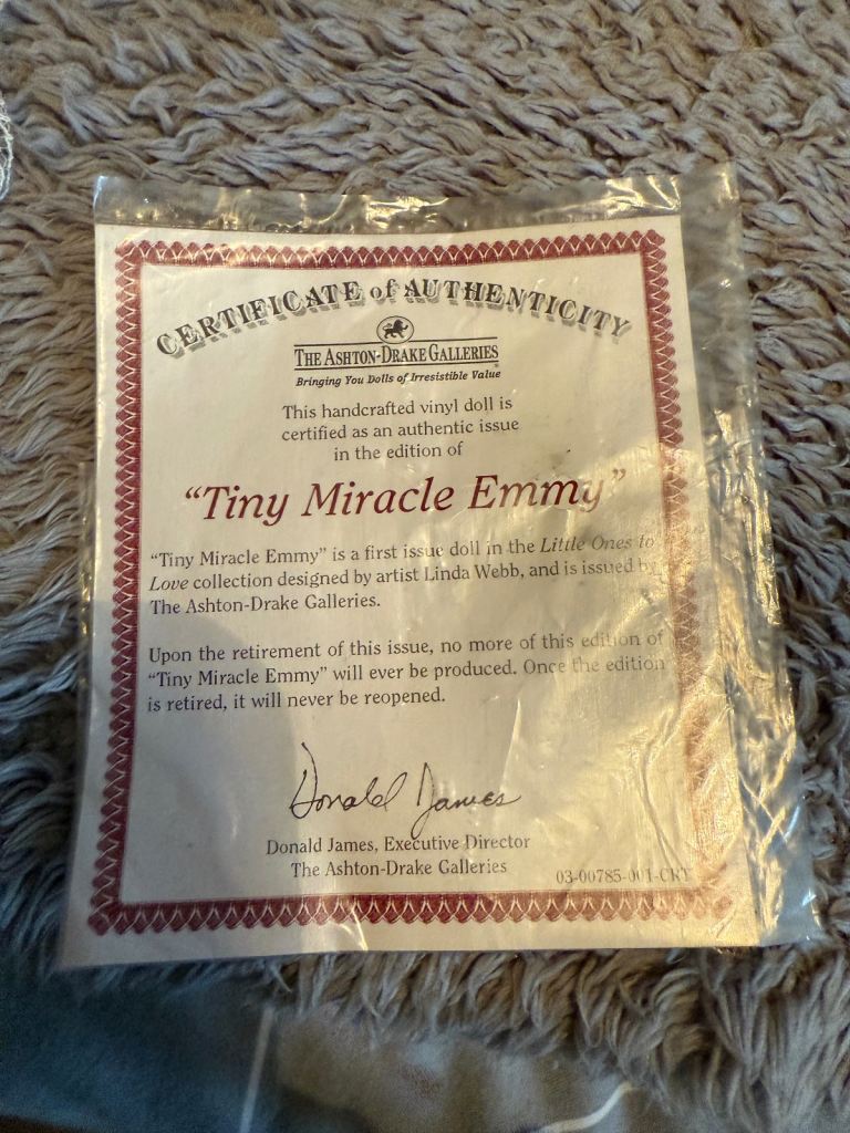 Ashton drake reborn doll comes with original certificate , comes with a Moses basket & pillow this was one of the last original tiny miracle Emmy dolls made as stated on the certificate the doll itself is 18 years old and as seen in the pics she’s in immaculate condition for 18 years