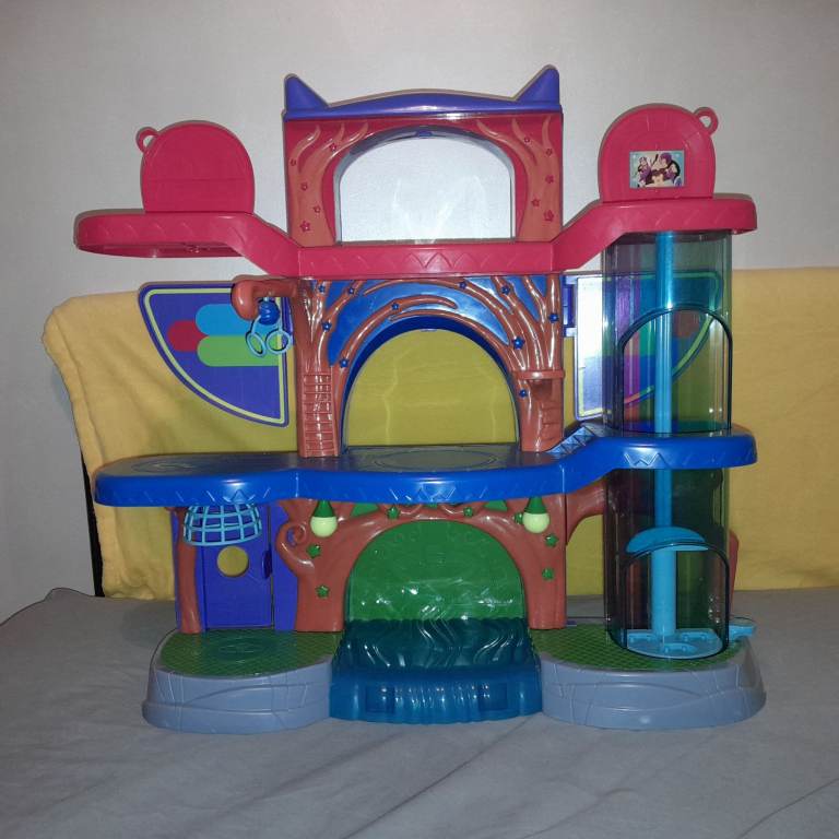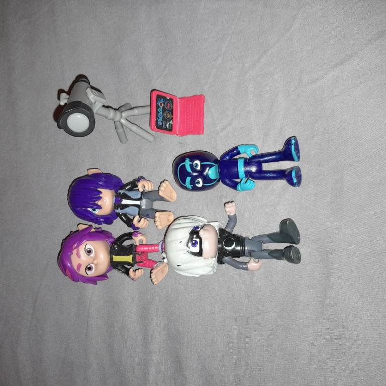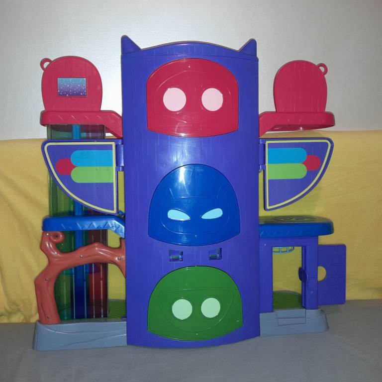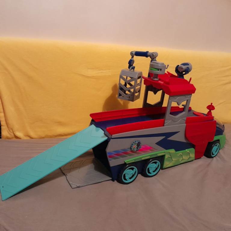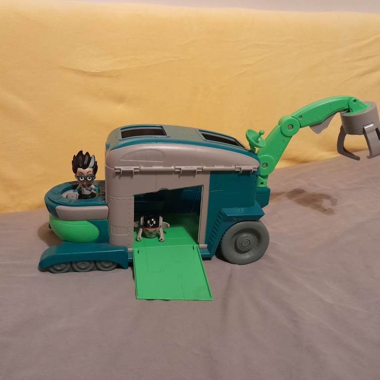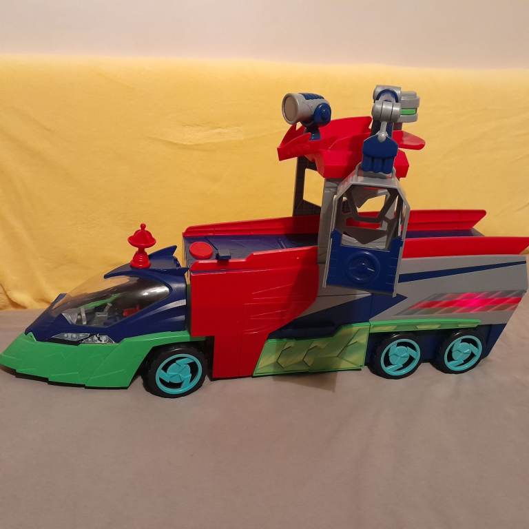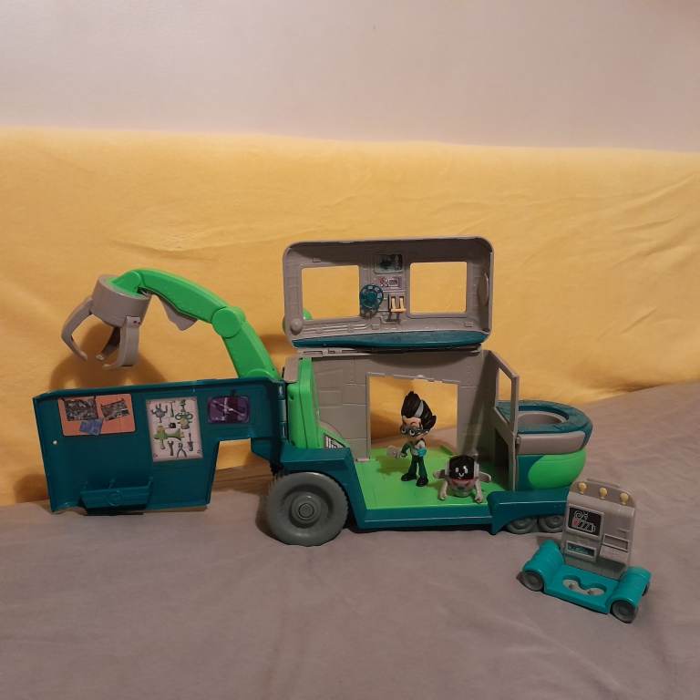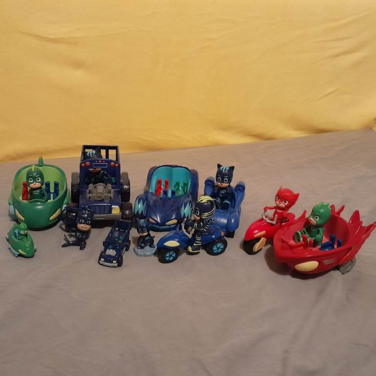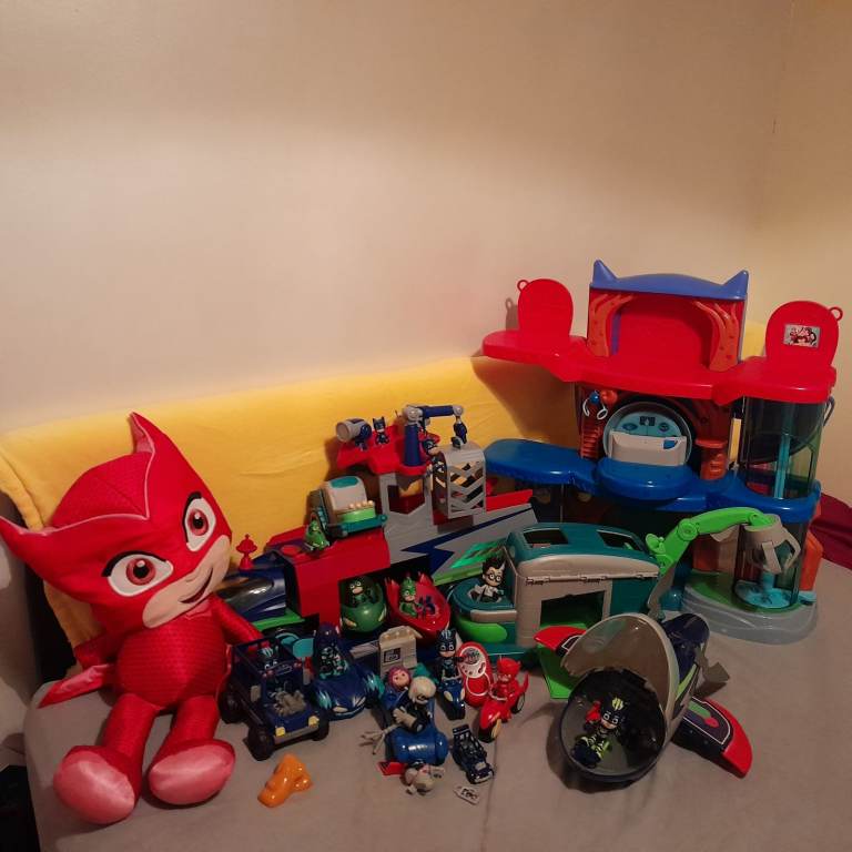 A large bundle of PJ Mask toys. PJ Mask HQ, PJ Mask seeker truck, PJ Mask Supermoon adventure rocket- no legs (and possibly no sound, but not tested). Romeo's science lab. 11 figures with movable limbs, including Cat Boy, Gecko, Owlette, Romeo, Luna Girl, 2 of the Wolfy kids. 9 smaller vehicles, 7 of which the figures can be positioned in. A soft toy Owlette, and a few other PJ Mask themed items. Delivery may be available if required. Any questions, please ask.