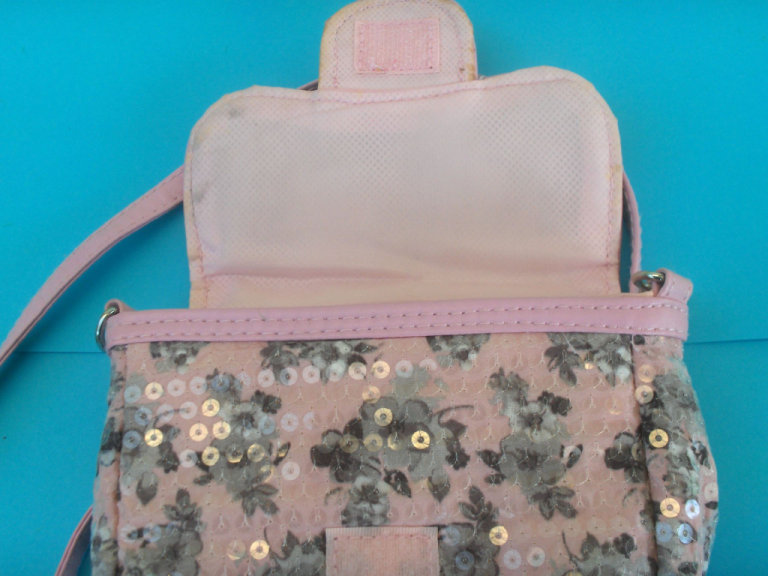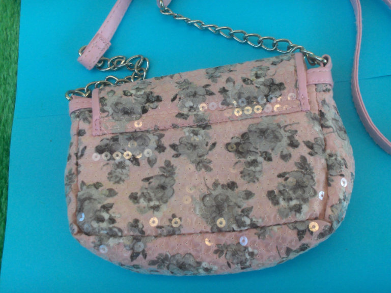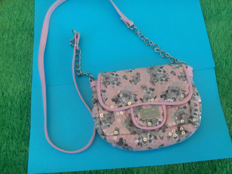 Pocket Money Presents. Pretty Pink Handbag with Grey Flowers and lots of Sparkling Sequins......