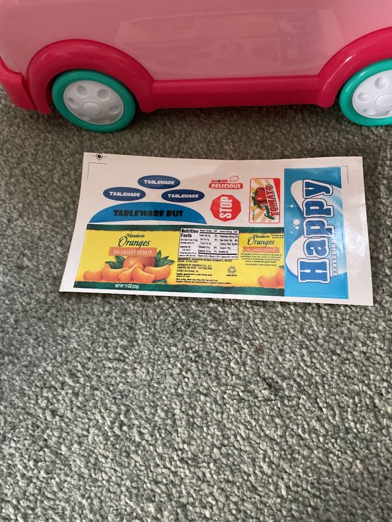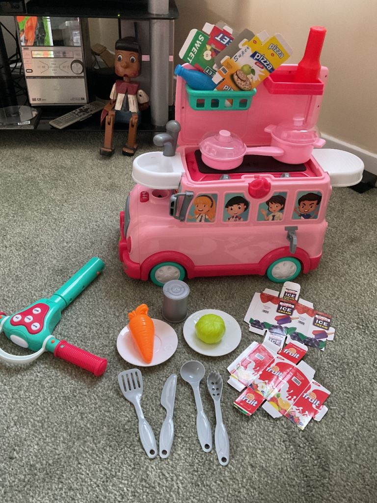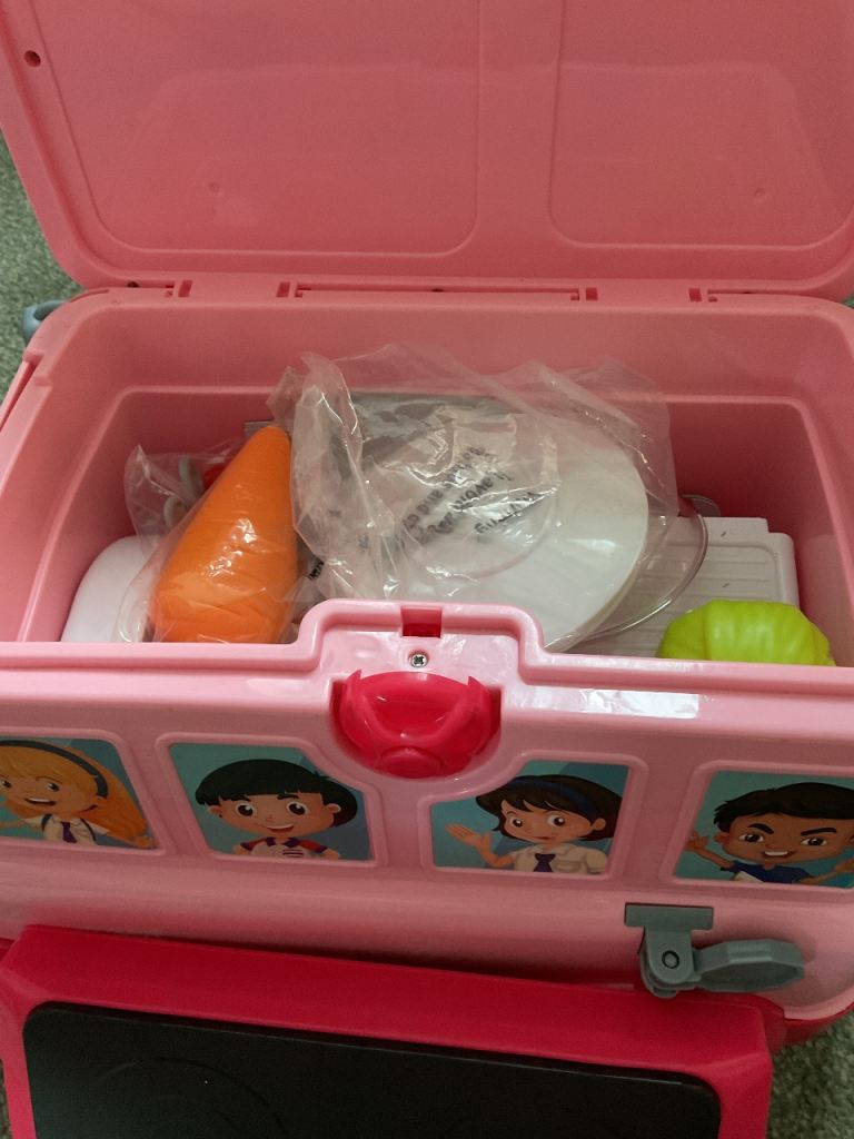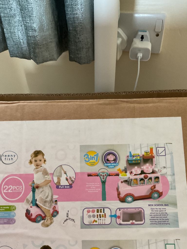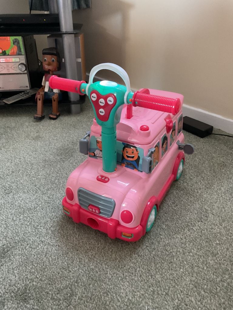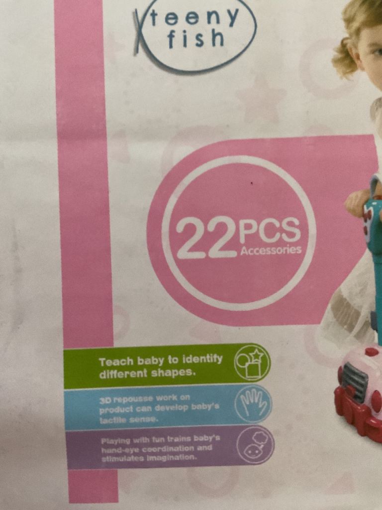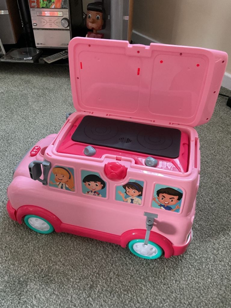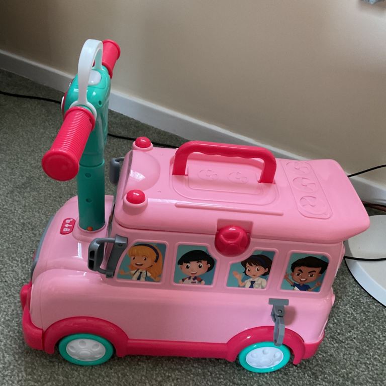 Tiny fish ride on bus very educational, lift the lid to reveal 2 hot plates that switch on and off, take this out to reveal all the lovely parts pots pans, fruit, + boxes that have to be made up, musical, plus storyteller etc, this is a lovely toy and is brand new so parts are quite tight to fit together for the first time, hours of fun for your little one on Christmas Day. (Not suitable for kids under 36months)