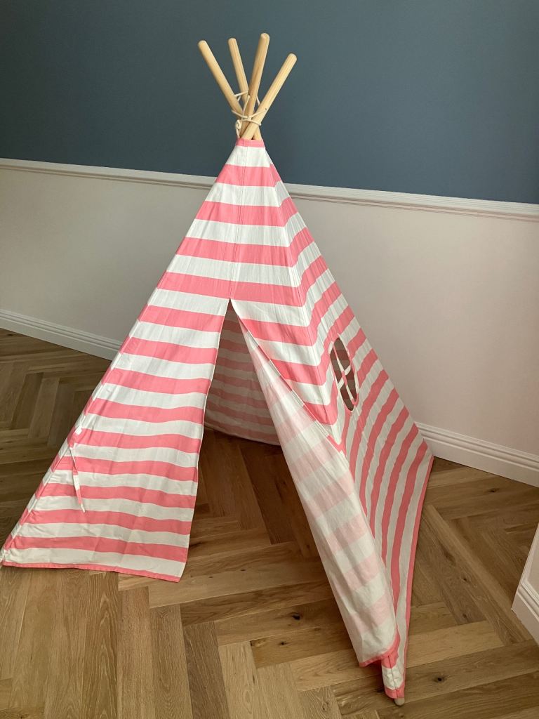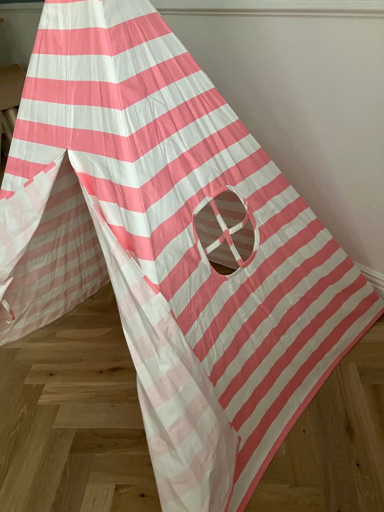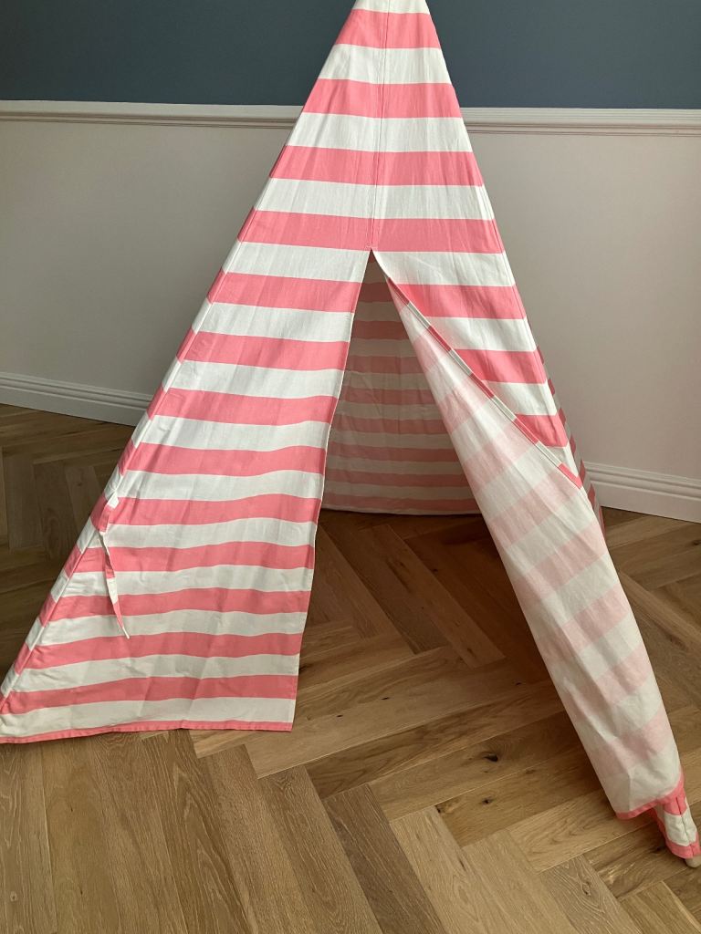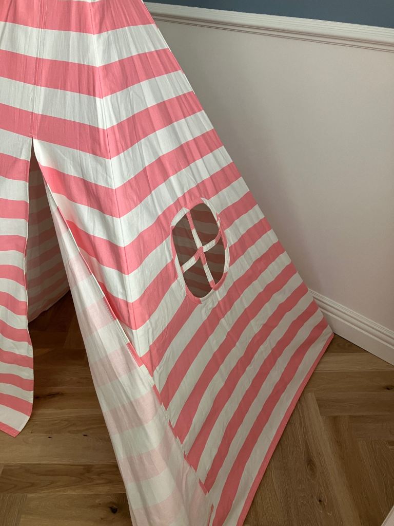 Tiny Land cotton canvas play teepee in pink and white strip design.