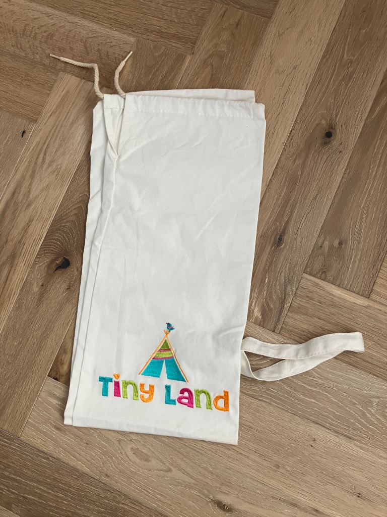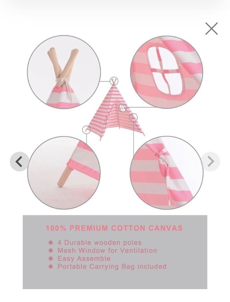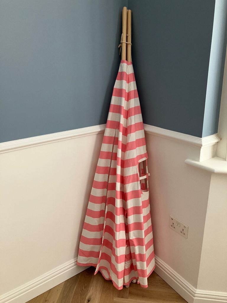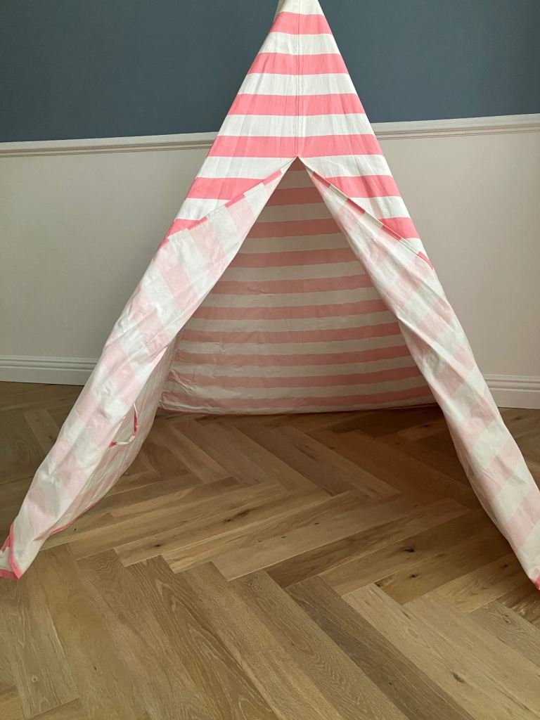 Tiny Land cotton canvas play teepee in pink and white strip design.