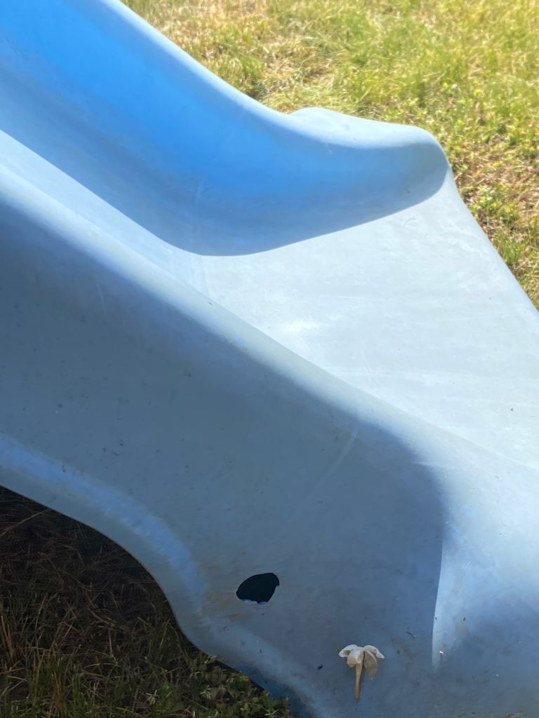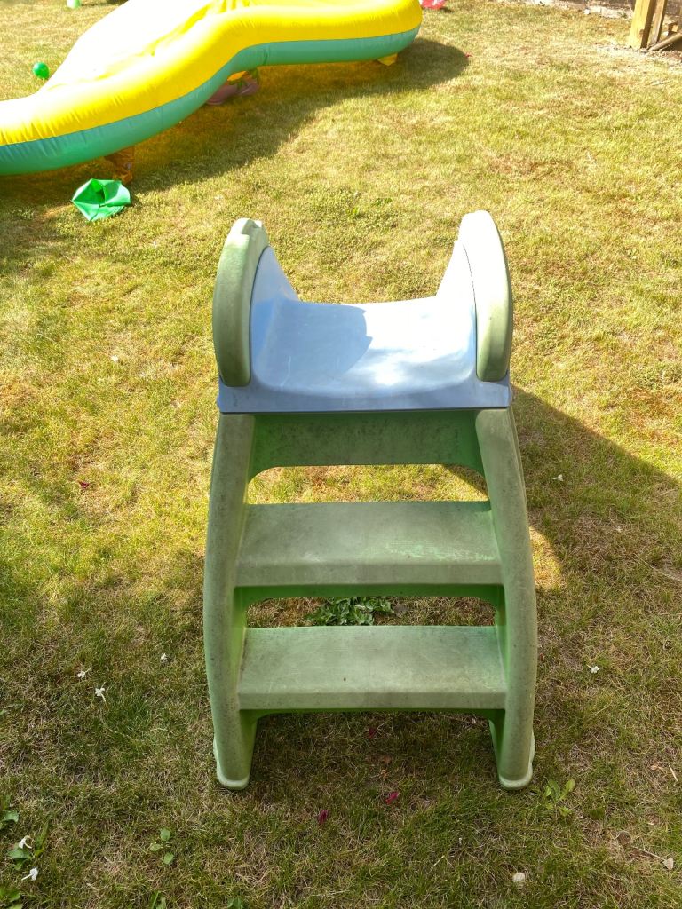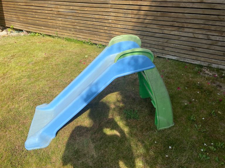 Blue kids slide. Faded due to sun but otherwise fine to use. Small hole on side but doesn’t effect use.
