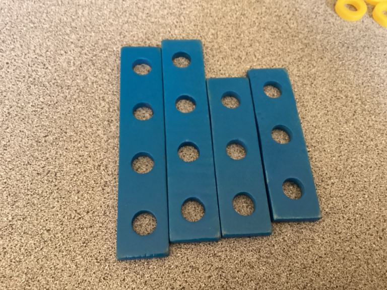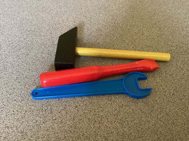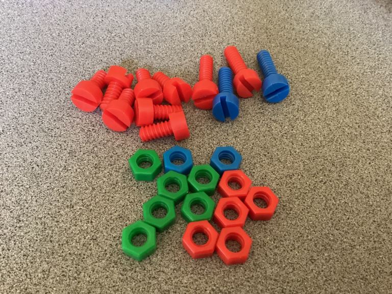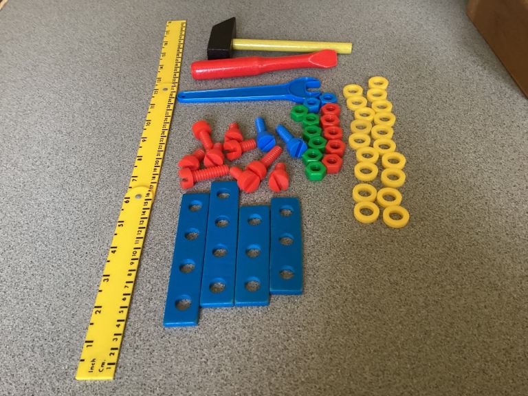 Toy tools in wooden box. Measure, screwdriver, spanner, hammer. Selection of plastic nuts & bolts and connecting pieces. Would meet in Malvern or St.John’s, Worcester.